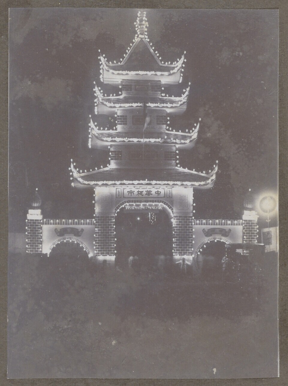 Met lichtjes versierd poortgebouw tijdens Pasar Male...