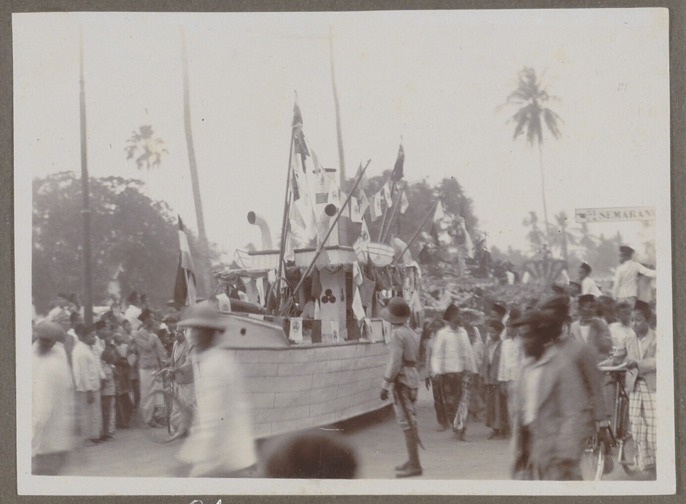 Versierde boot tijdens bloemencorso in Koedoes