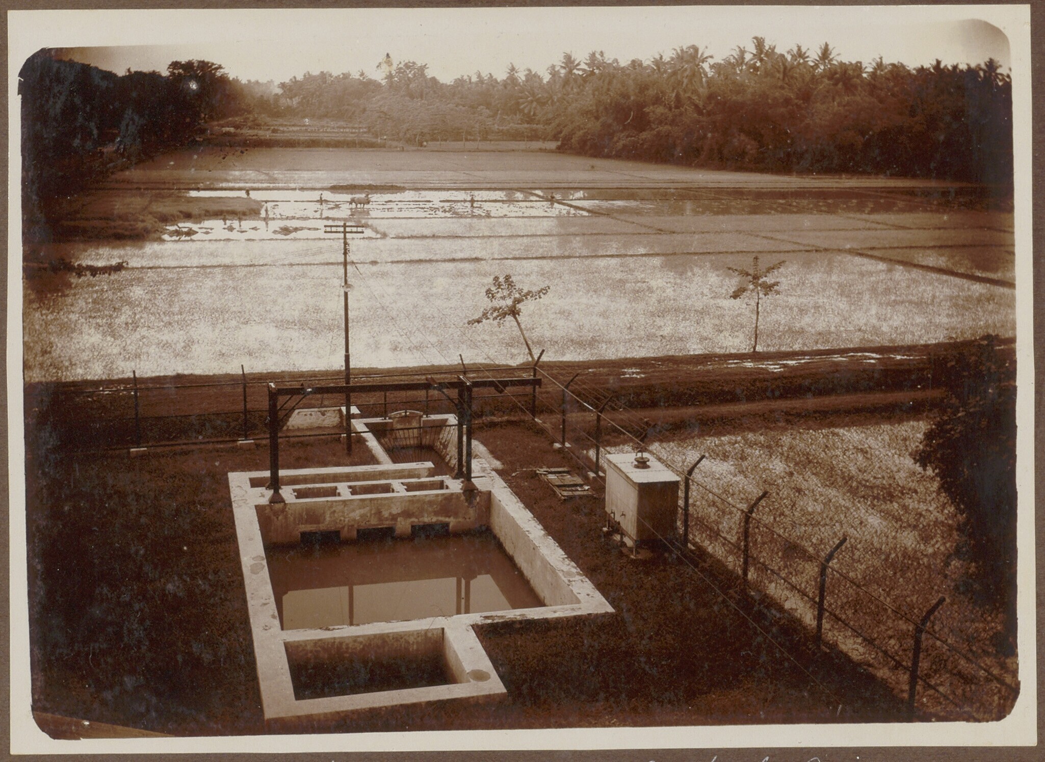 Uitzicht over de rijstvelden en de koelwatervoorzien...