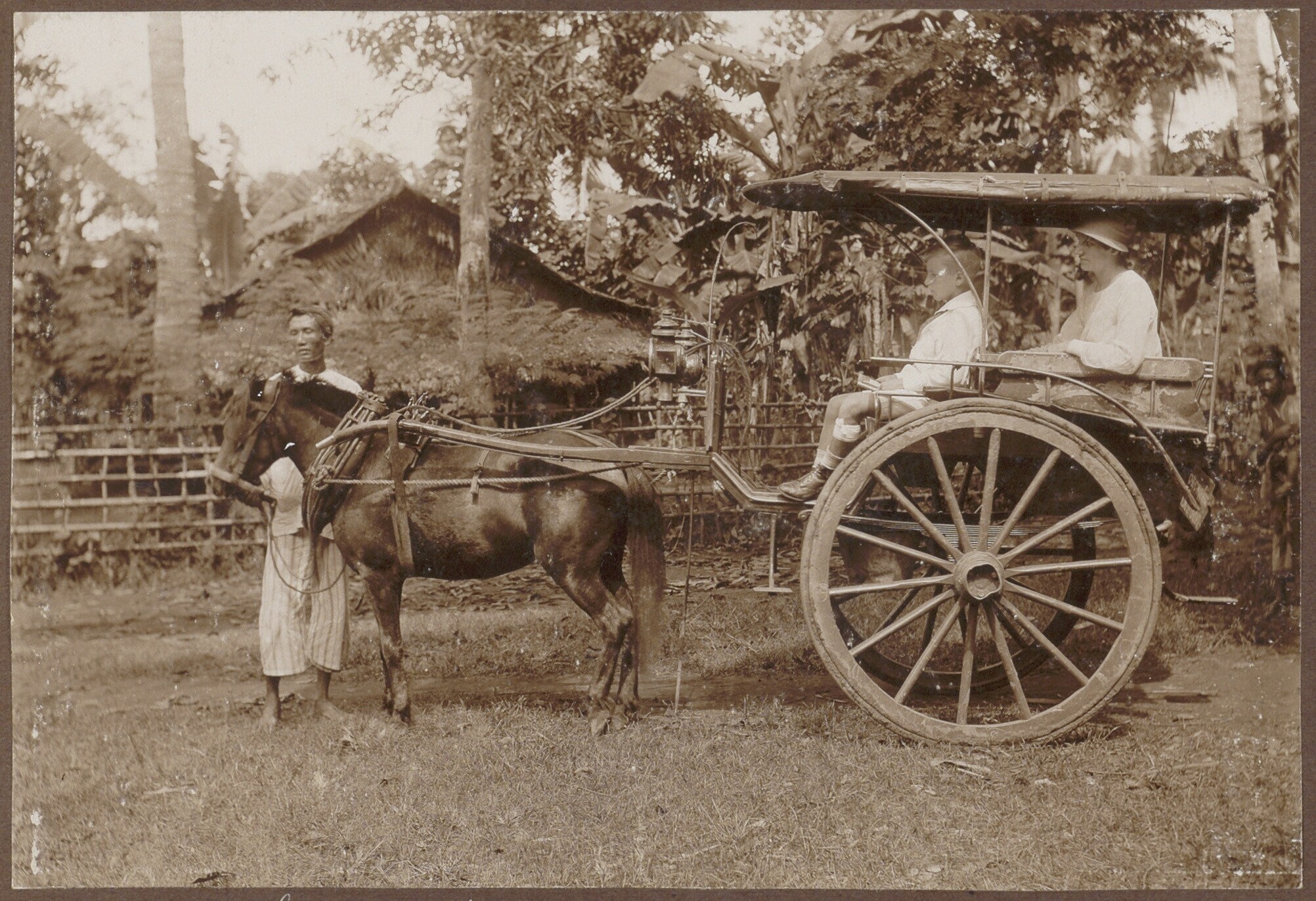 Vrouw en kind in paardenrijtuig te Soemberlawin bij ...