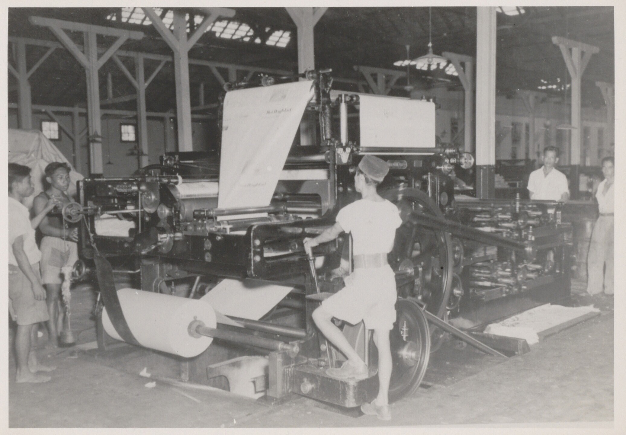 Europese en Javaanse mannen bij de balen papier voor...
