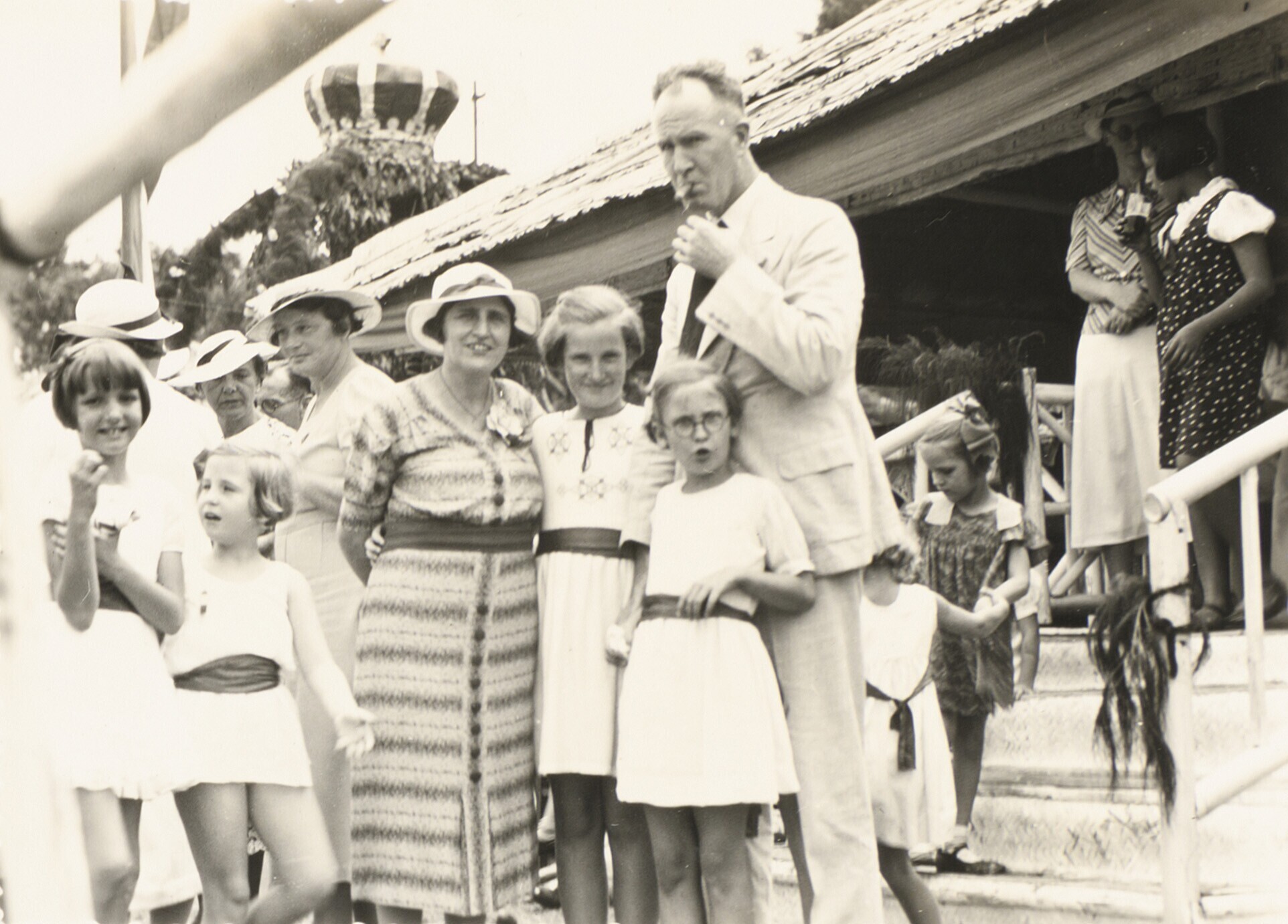 Europse man met twee kinderen en groep Javanen bij i...