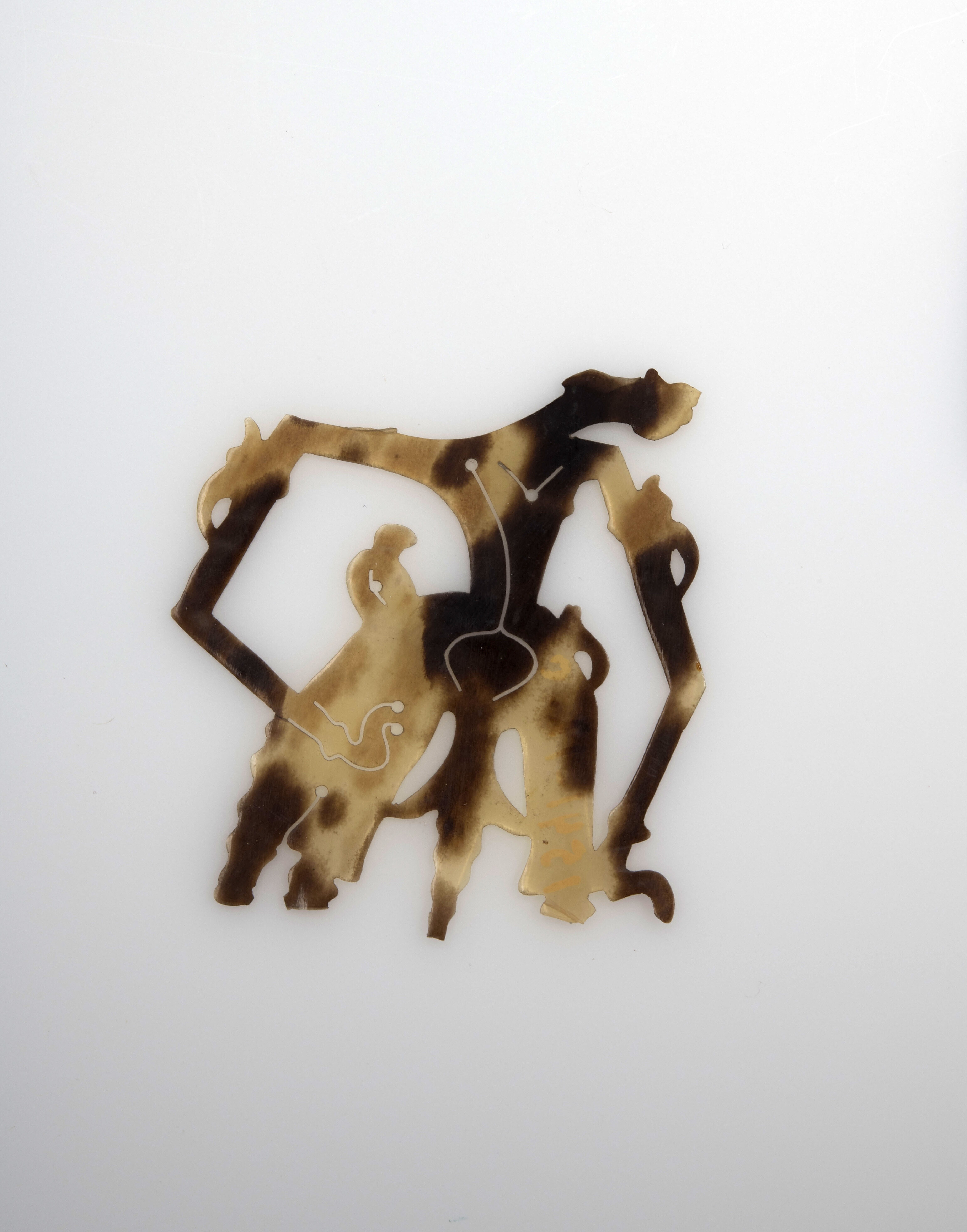 Schildpad wayangfiguur op zwart hoornen voetstuk