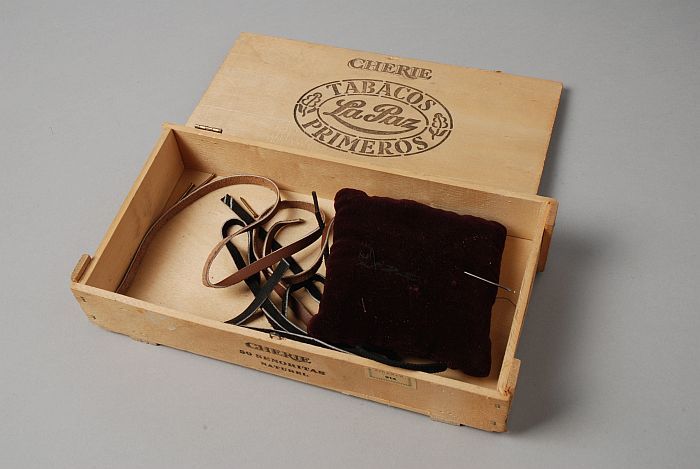 Sigarenkistje met naaigerei, gebruikt bij schoenmake...
