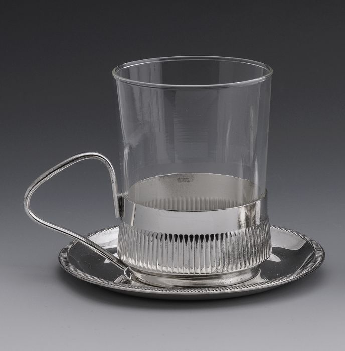 Verzilverde houder (A) met koffieglas (B) en zilvere...
