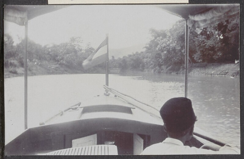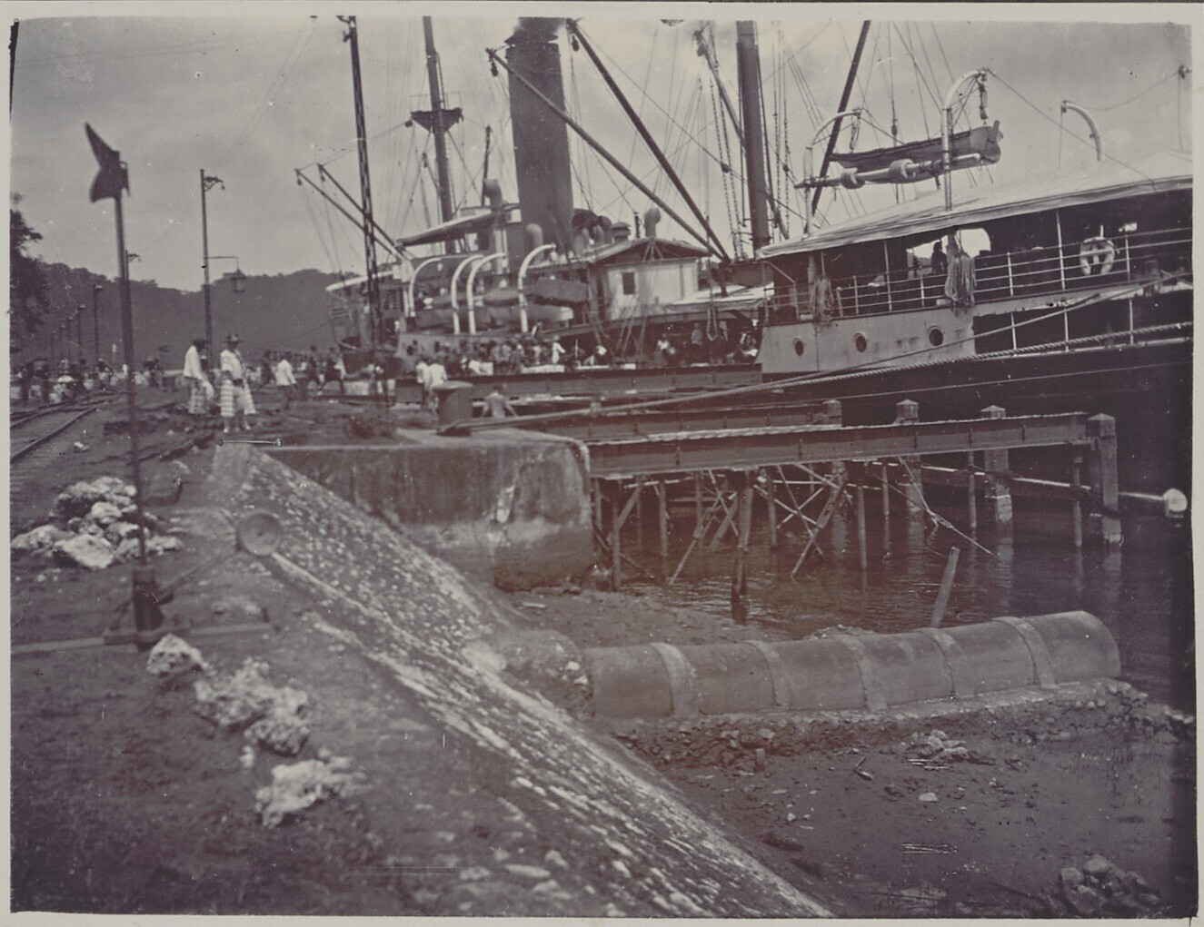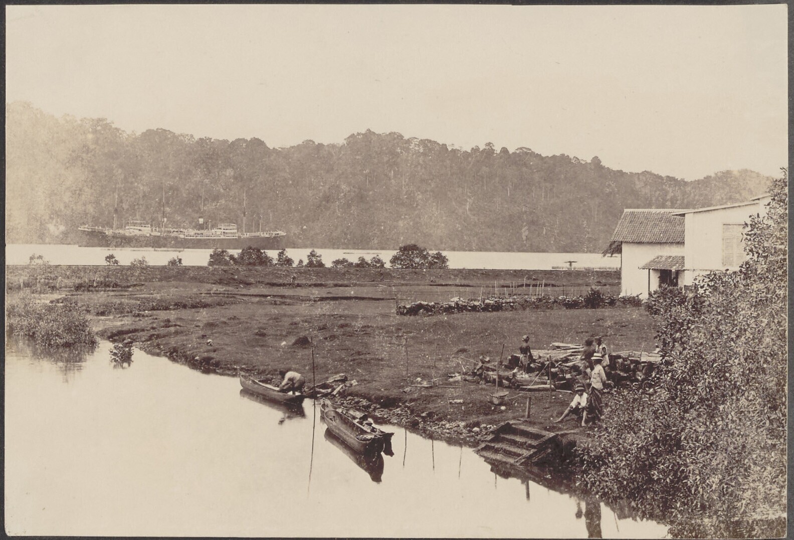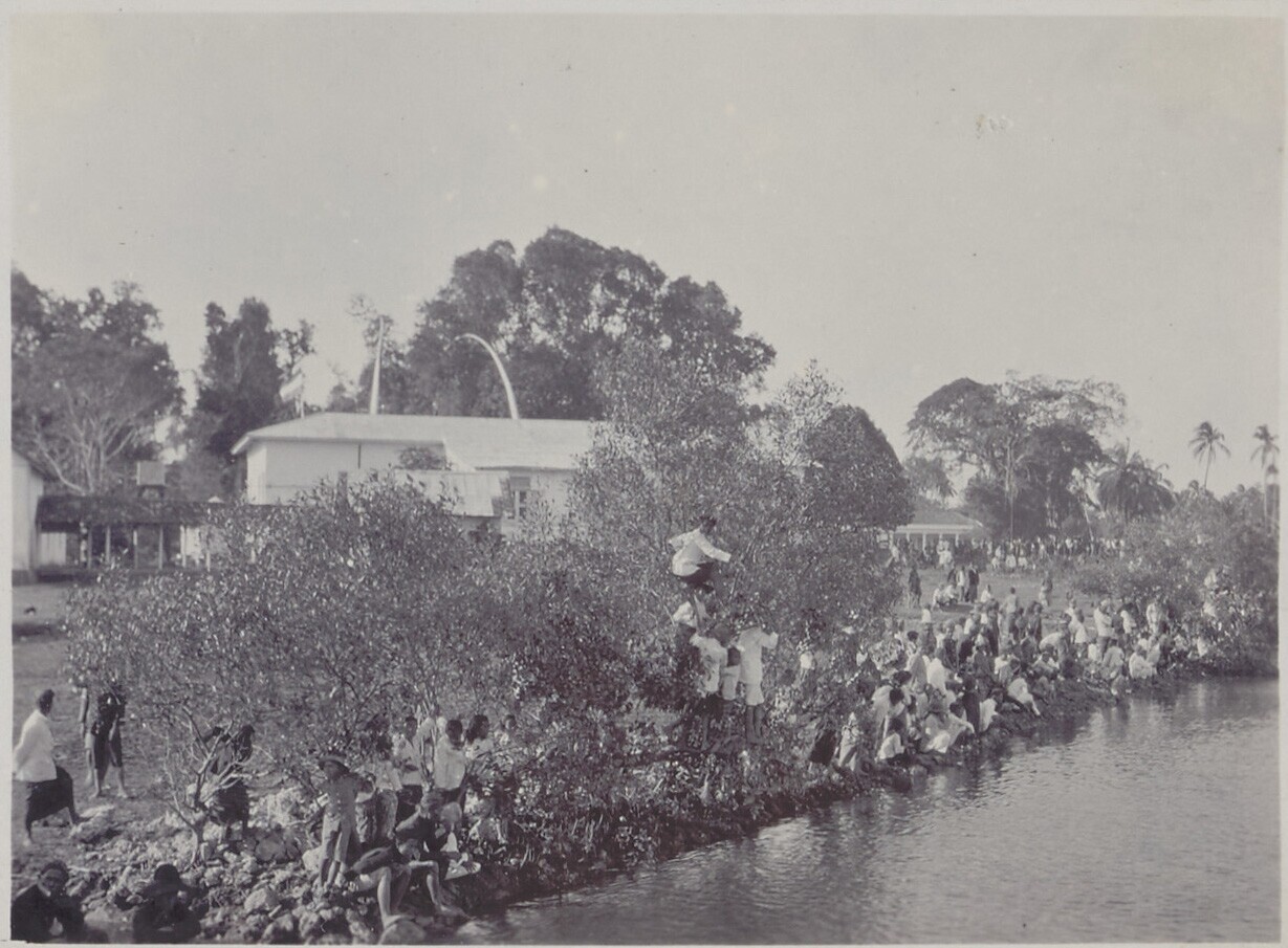 Nederlandse en Javaanse mensen staan op kade, bij he...
