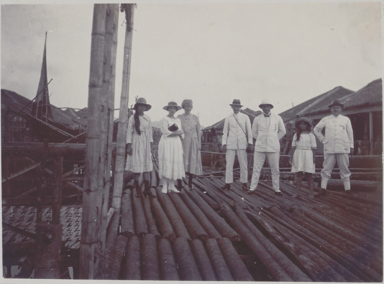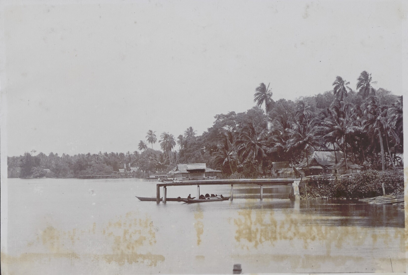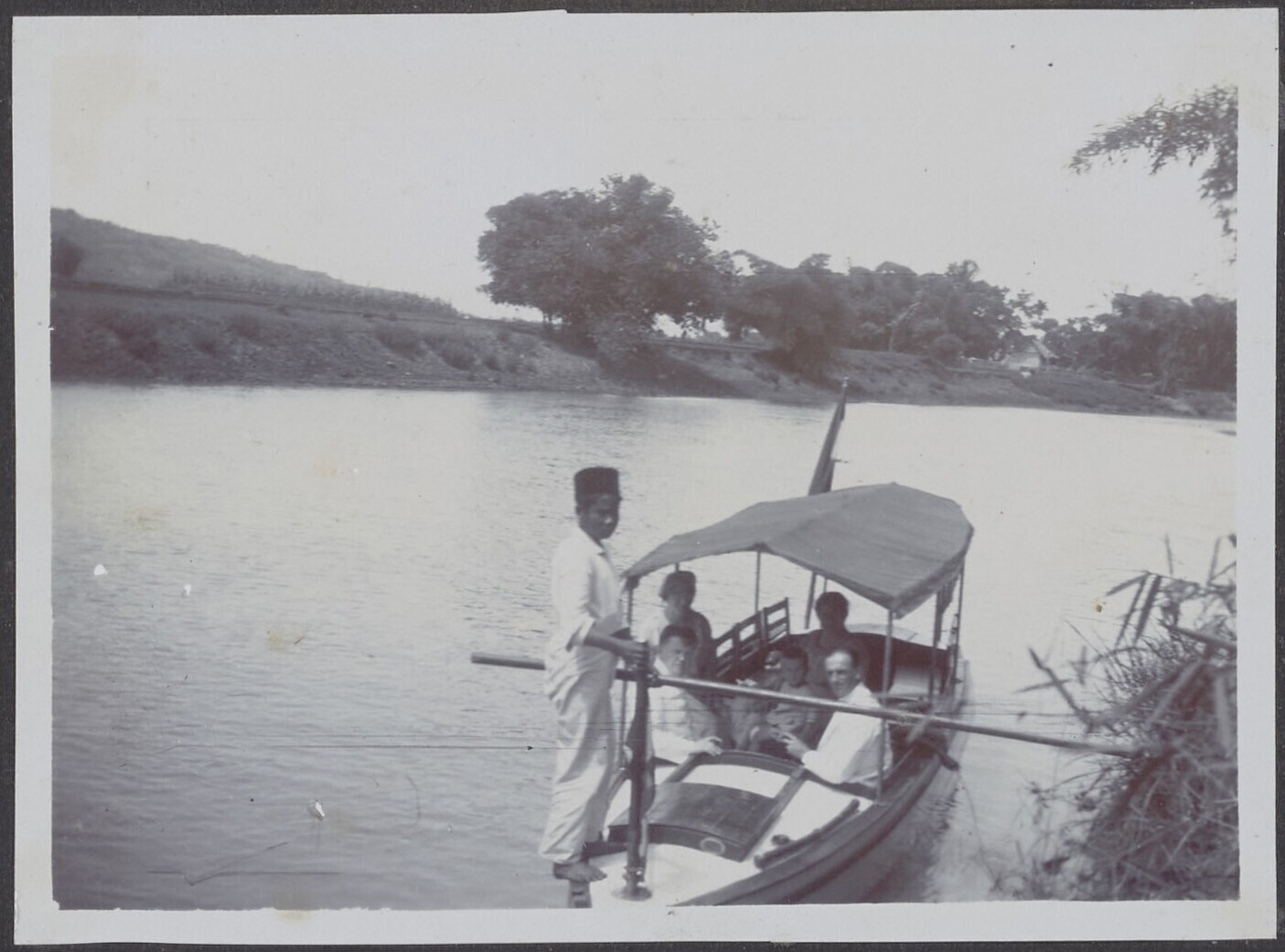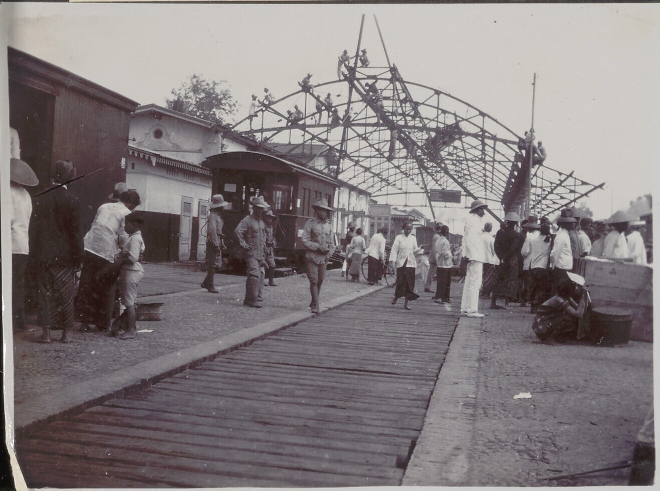 Nederlandse en Javaanse mensen staan op kade, bij he...
