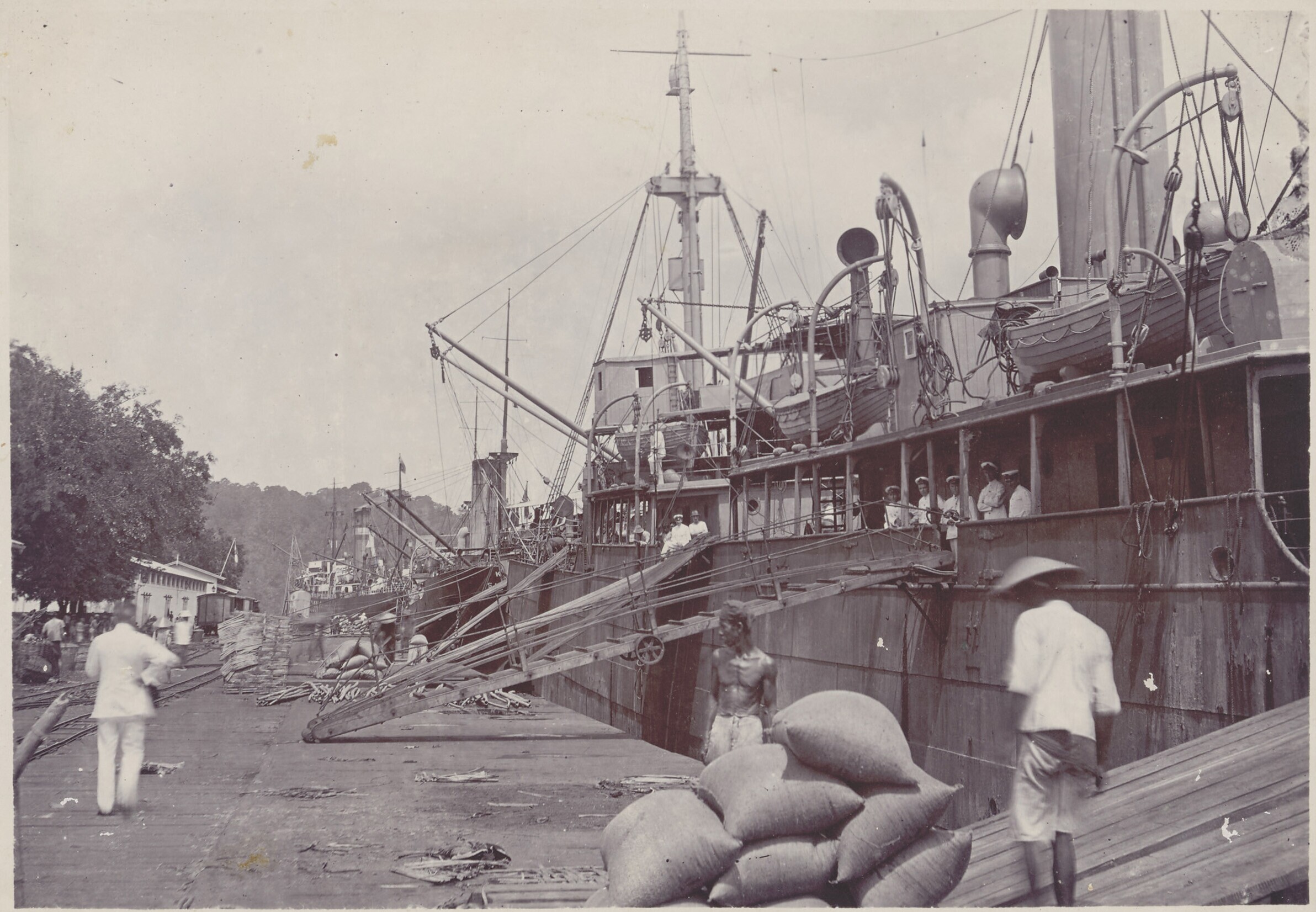 Er is een stoomschip afgemeerd in de haven van Tjila...