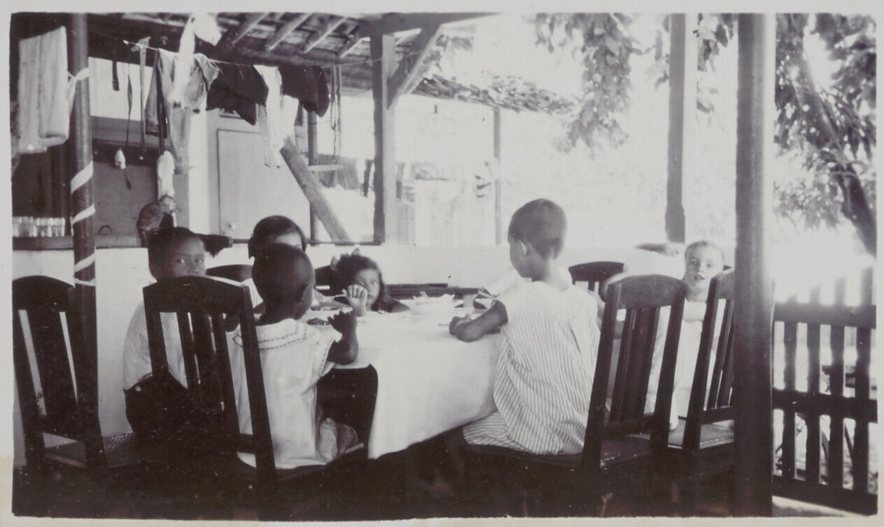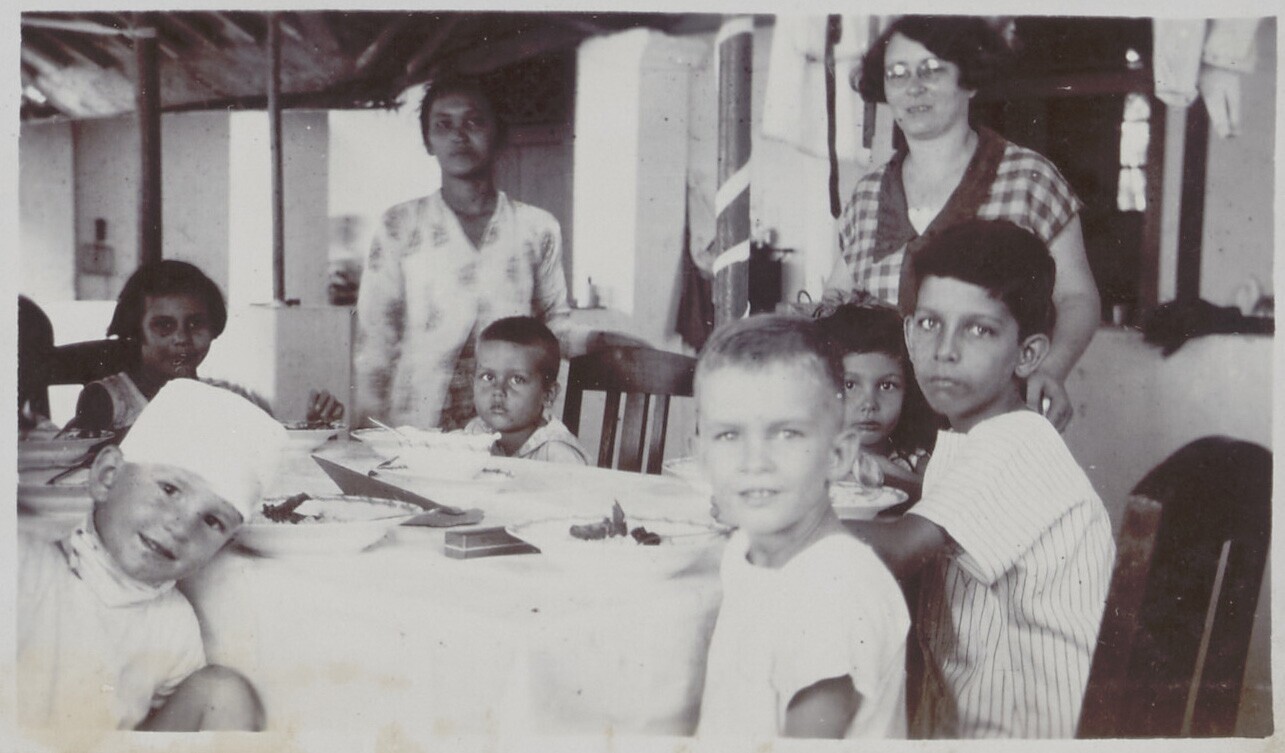 De Javaanse en Nederlandse kinderen eten aan de tafel