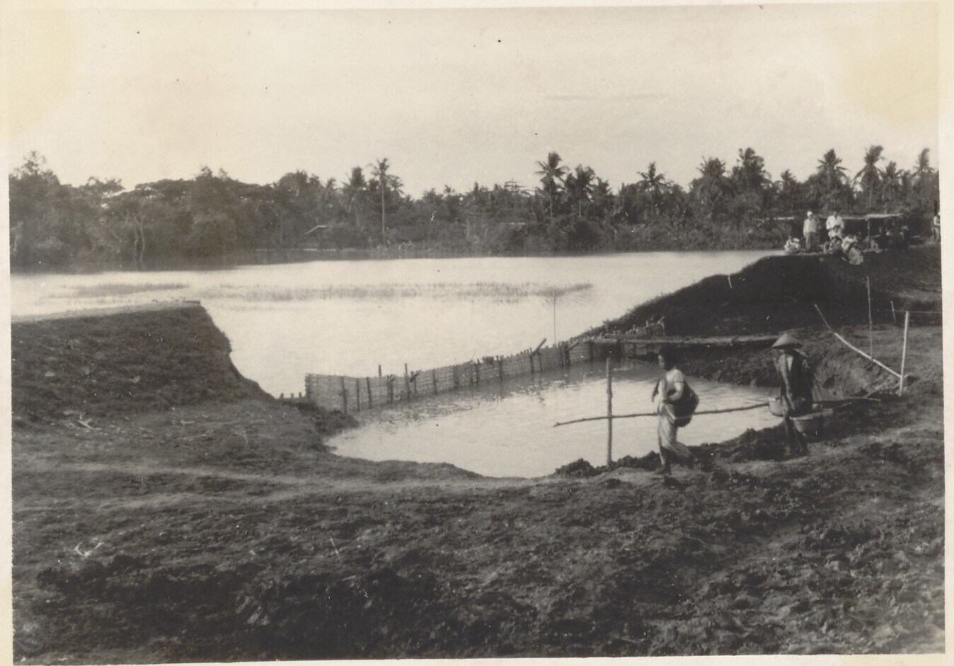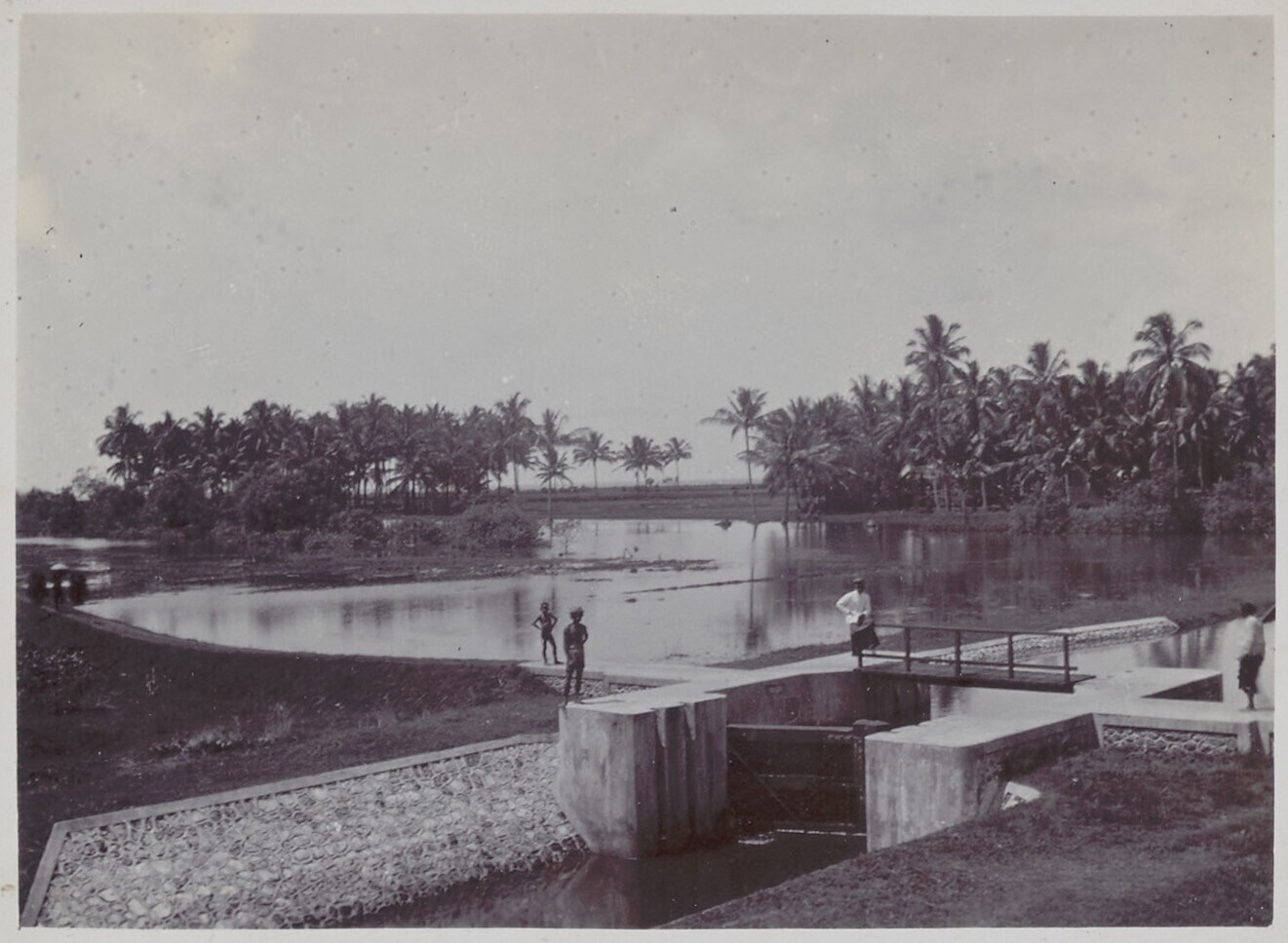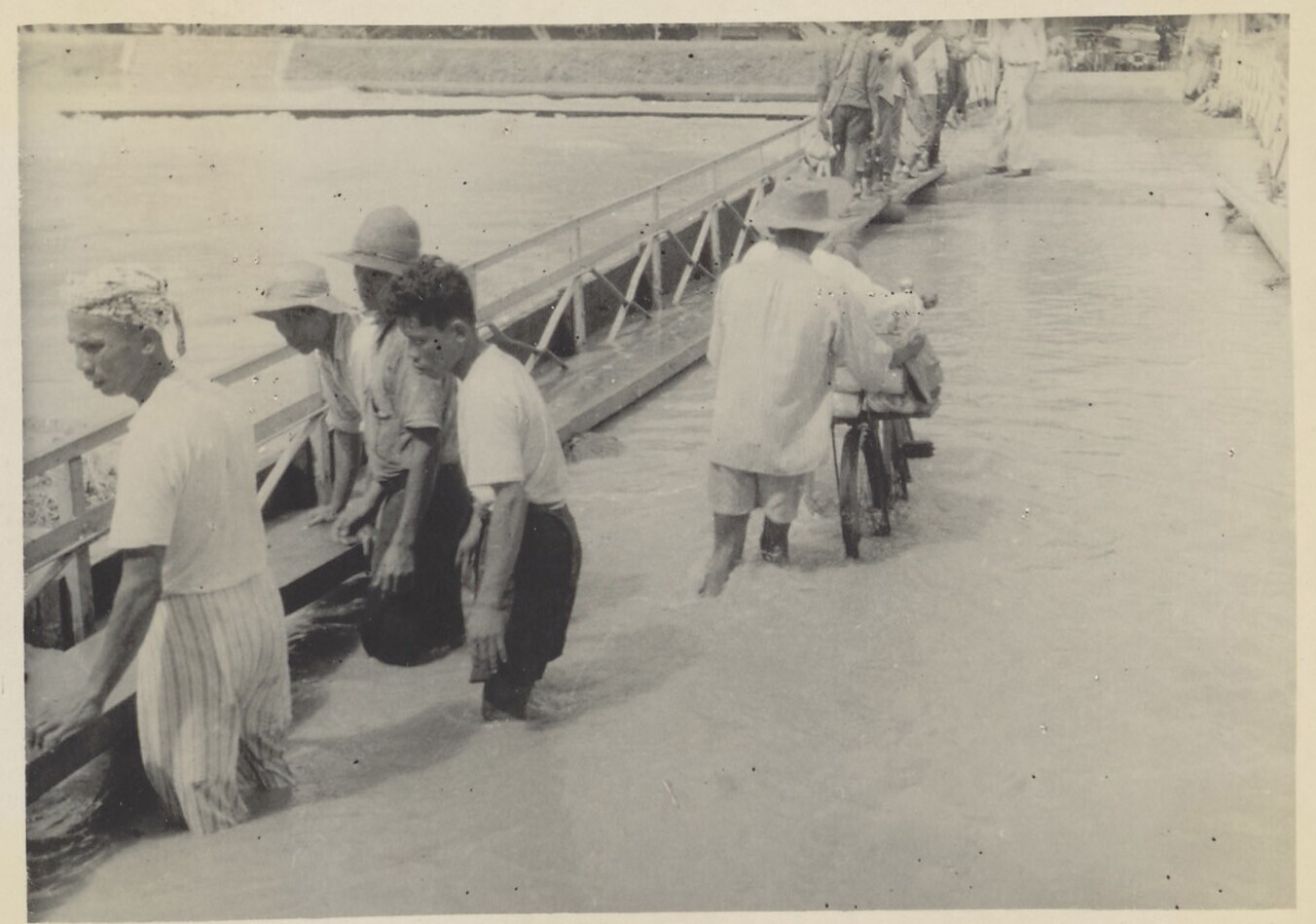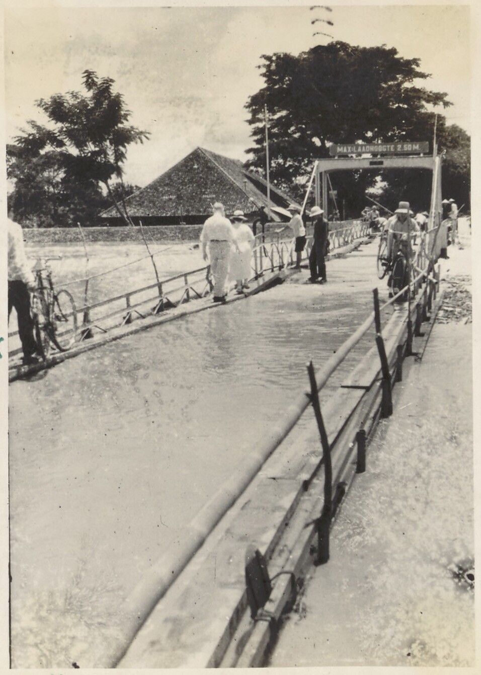 Javaanse mensen op overstroomde brug te Indramajoe