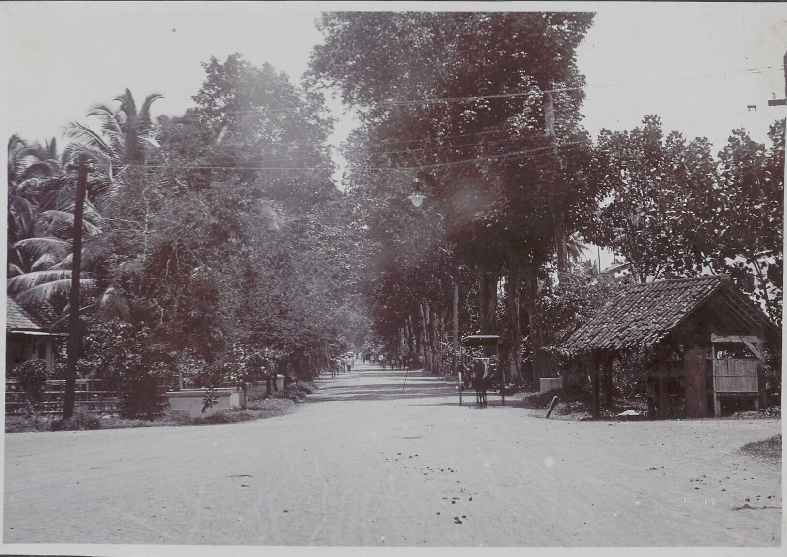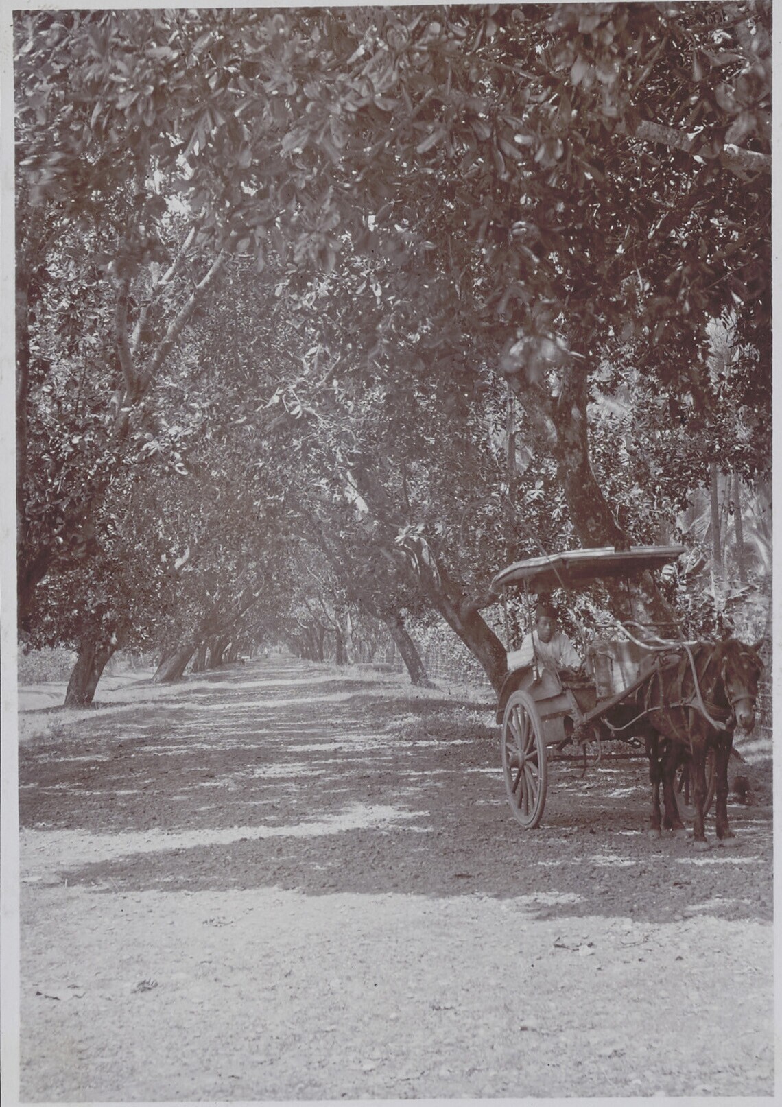 Een rijtuig rijdt door de met bomen omzoomde straat
