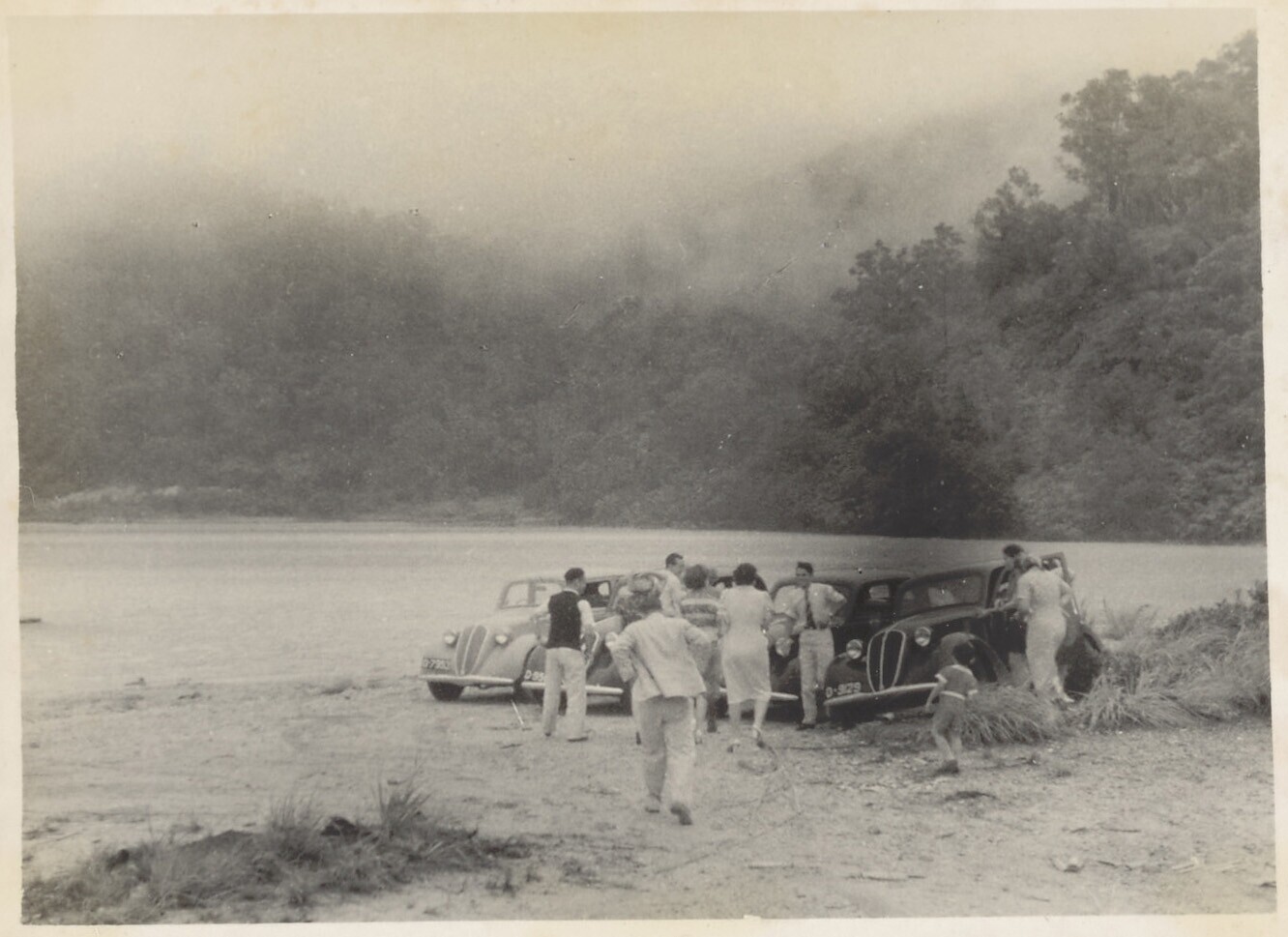 Fam. Bokma bij overstroomde brug te Indramajoe