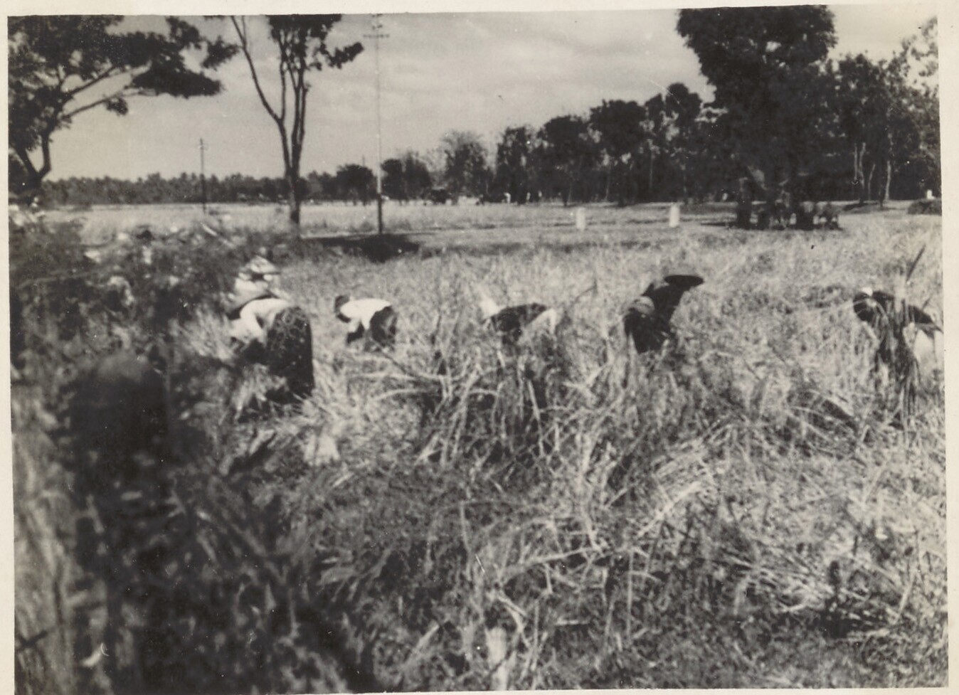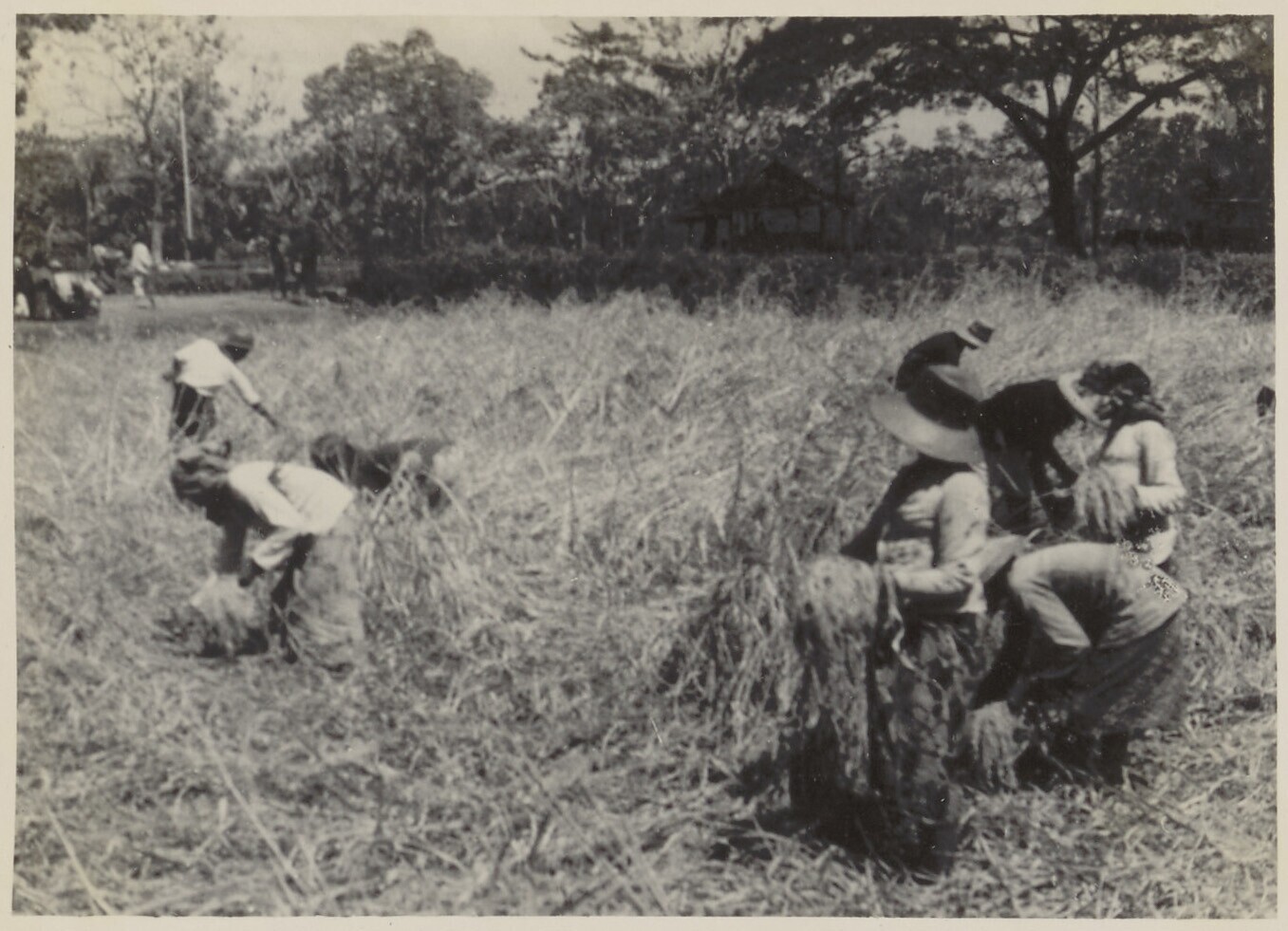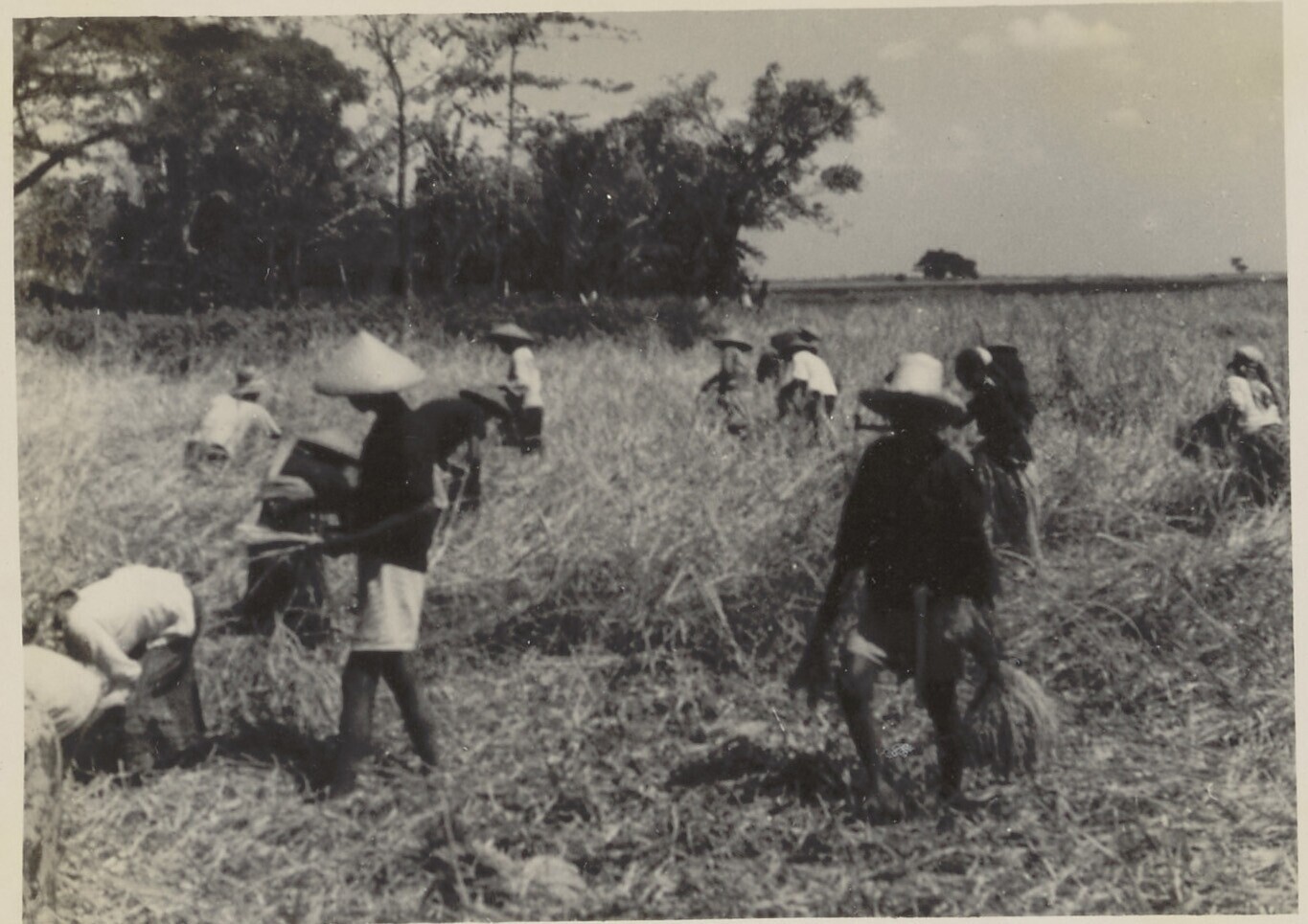 Javaanse landarbeiders bij het snijden van de padi n...