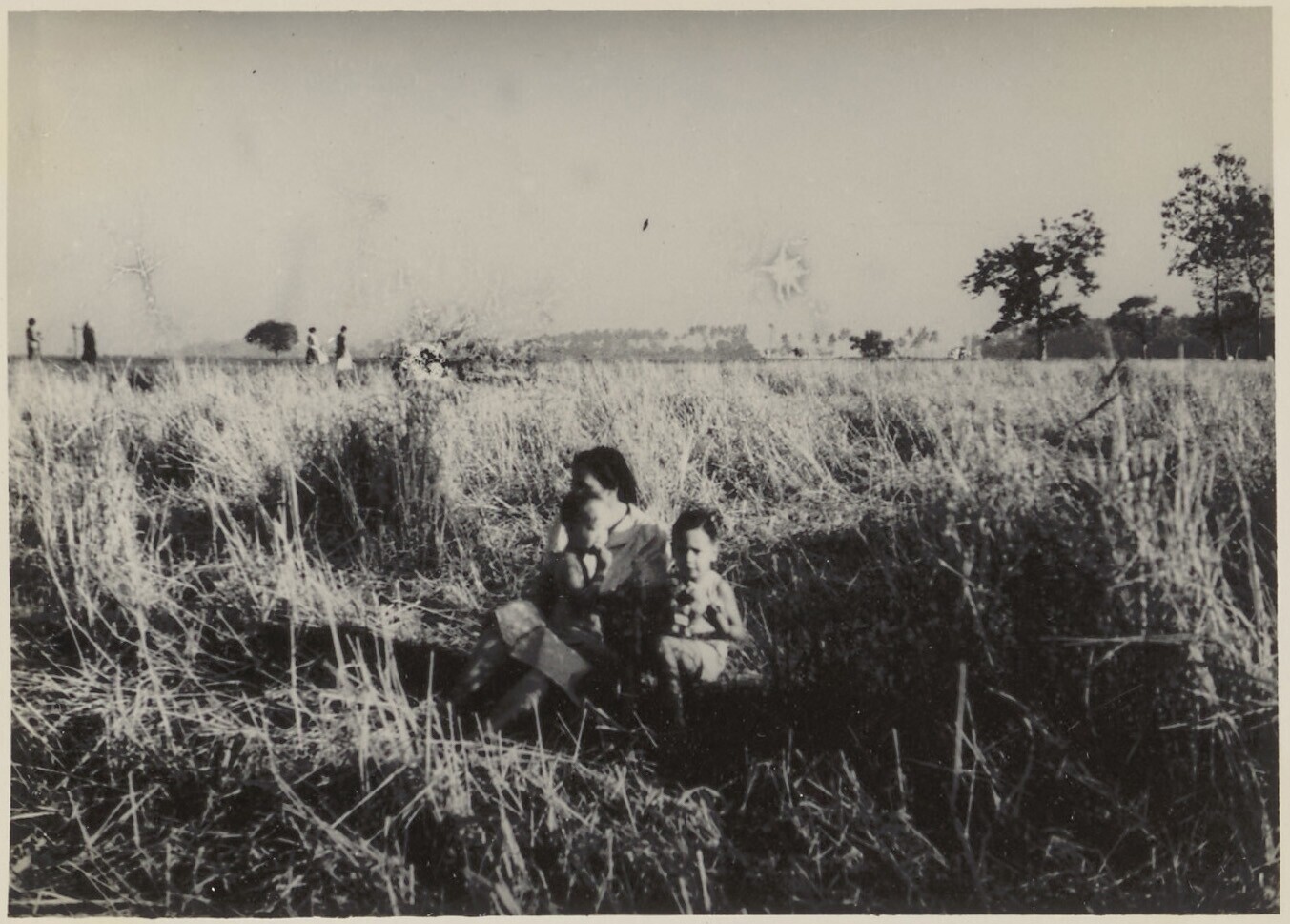 De familie J. Pieters en kinderen in veld van padi