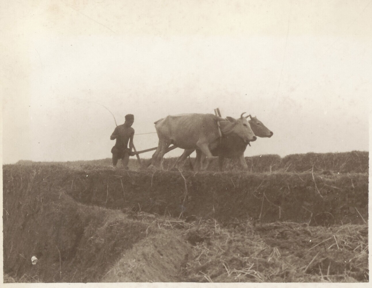 Javaanse landarbeider aan het ploegen met karbouwen ...