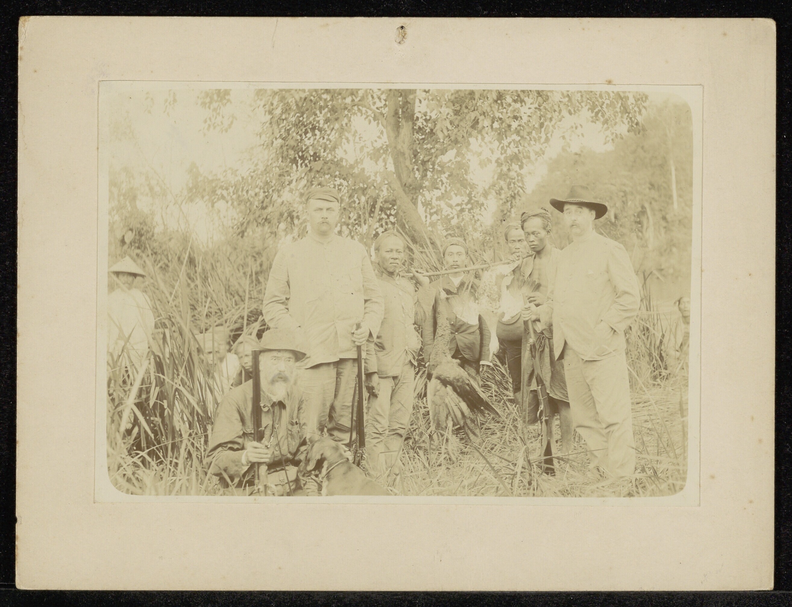 Groepsportret van jagers met een tijdens een jachtpa...