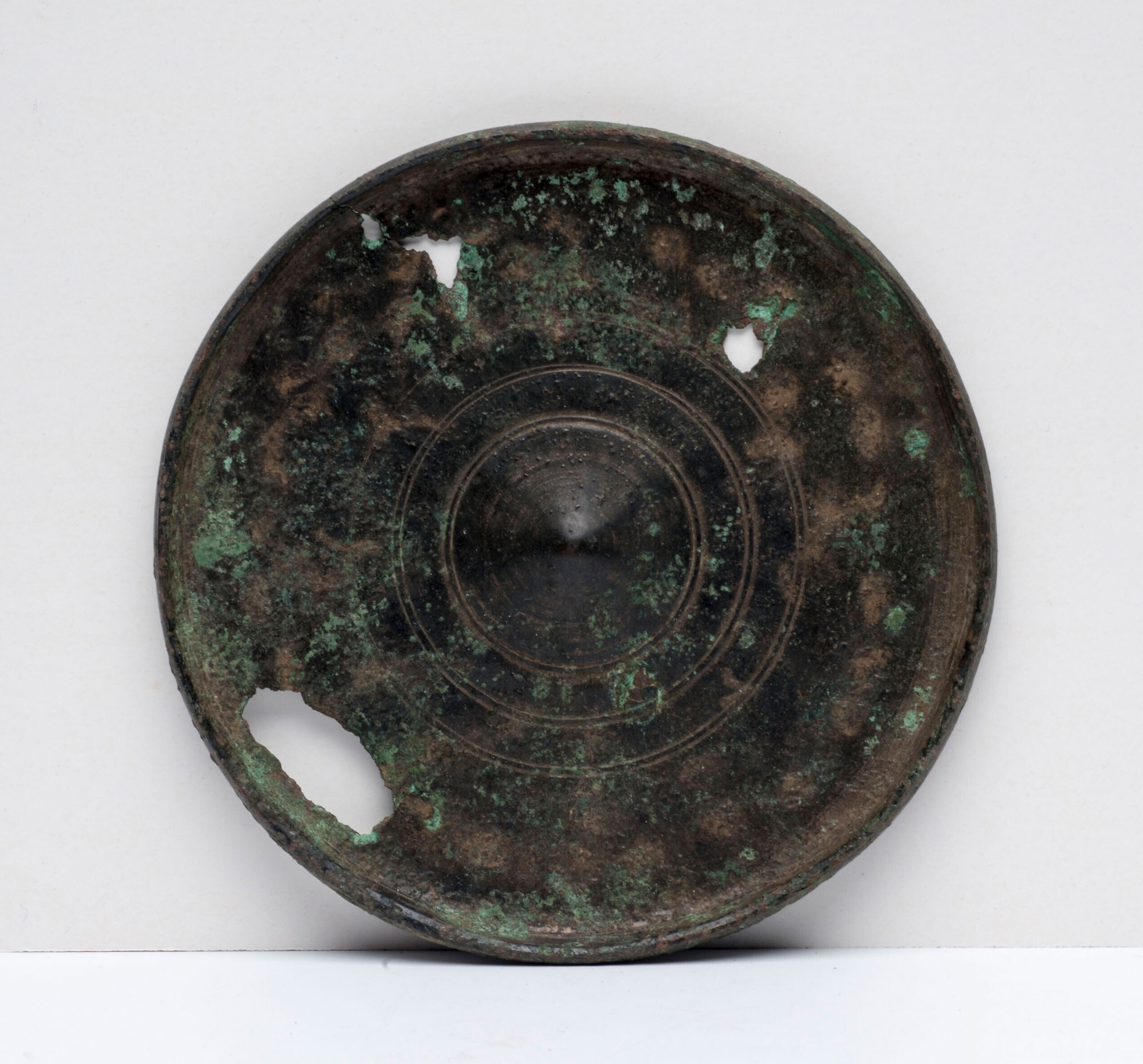 Beschadigde ronde bronzen spiegel zonder handvat