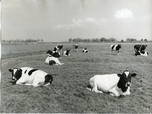 Foto in zwart-wit van een weiland met koeien door Jo...