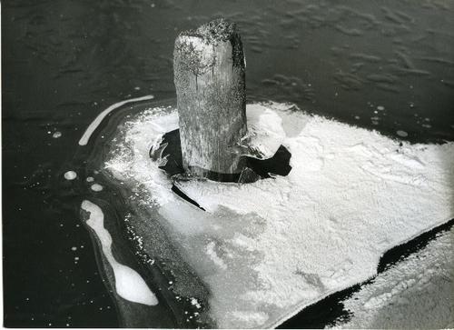 Foto in zwart-wit van een paal in het ijs door J.D. ...