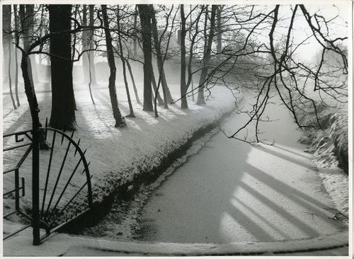 Foto in zwart-wit van een hek, sloot en bomen door J...