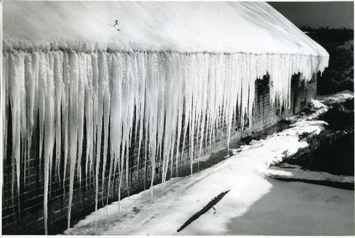 Foto in zwart-wit van ijspegels aan een rieten dak d...