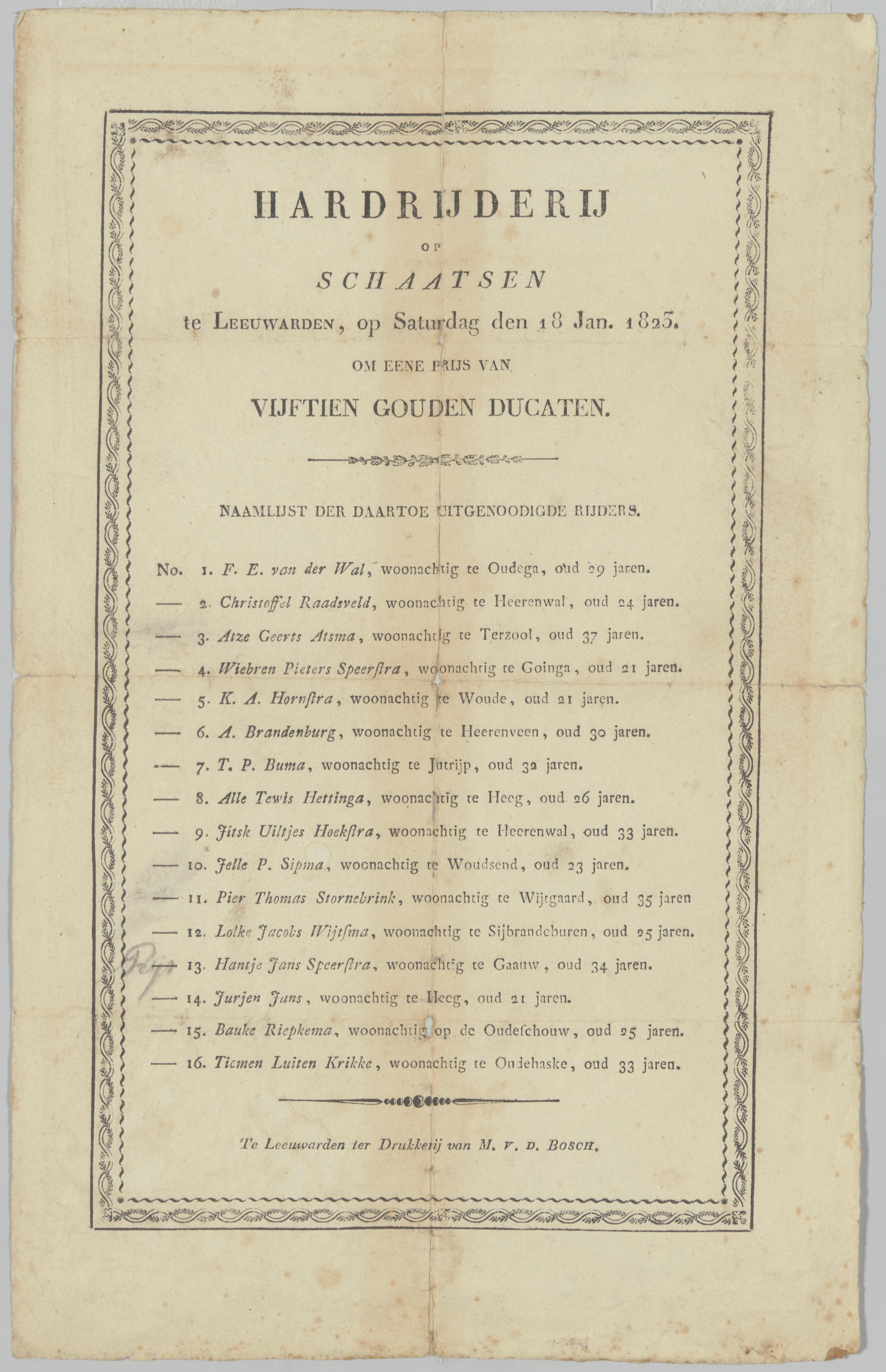Prent aankondiging wedstrijd 'Hardrijderij op schaat...