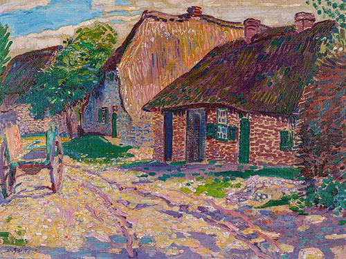 Landweg met boerderijen en boerenkar