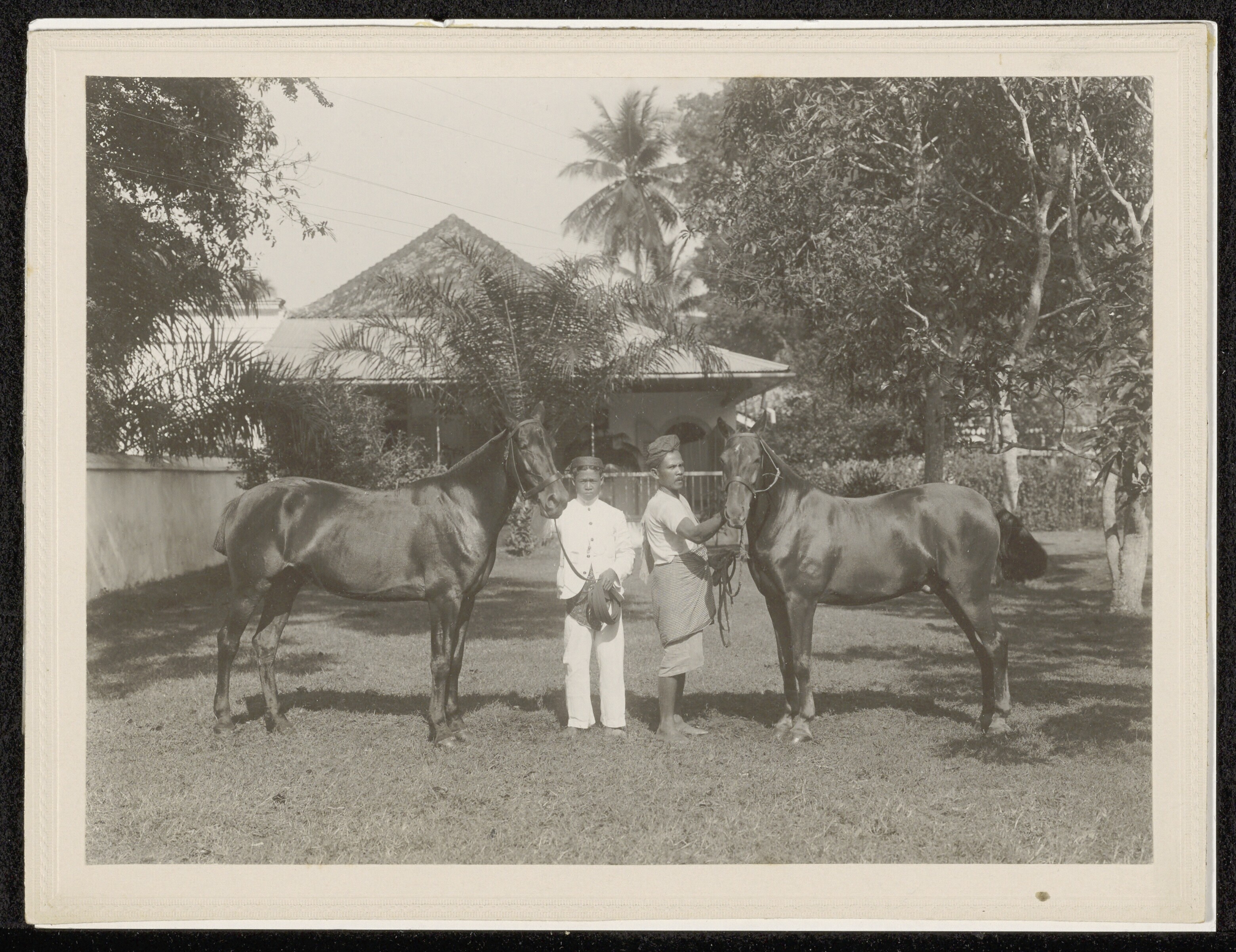 Huispersoneel met paarden in de tuin van een huis aa...