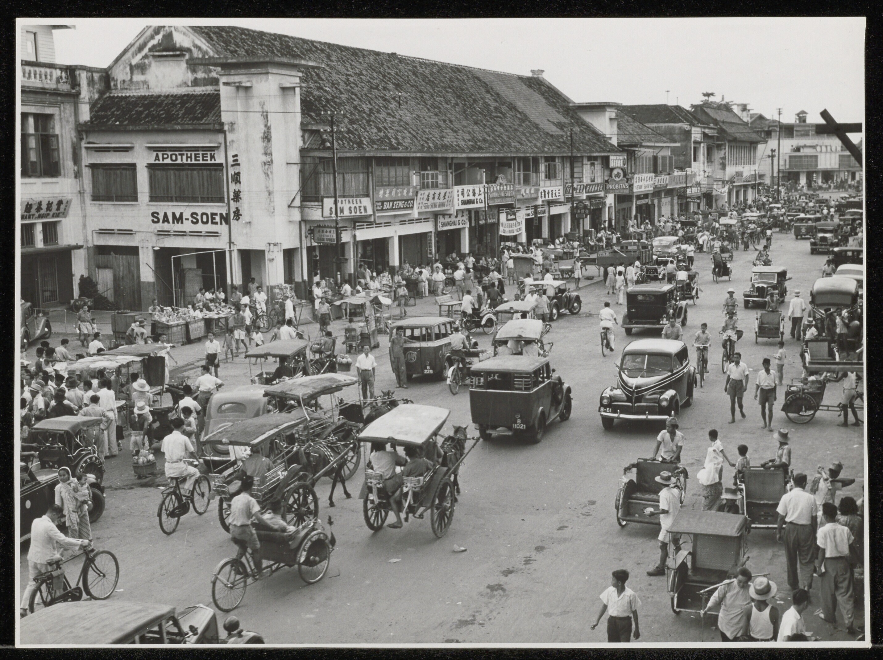 Straatgezicht met druk verkeer in Batavia