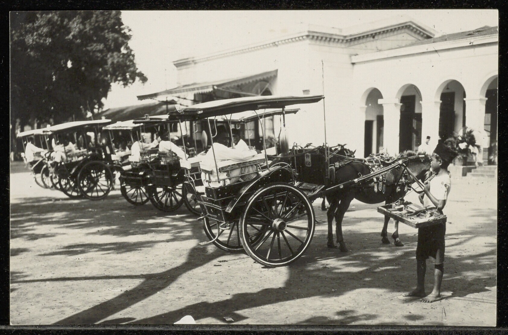 Een jonge straatverkoper en chauffeurs met hun rijtu...