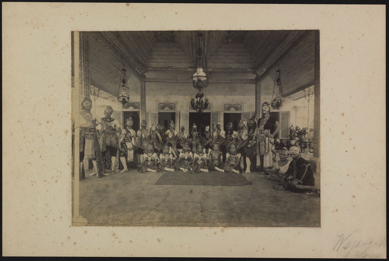 Groepsportret van Wajang Wong dansers met Gamelan mu...
