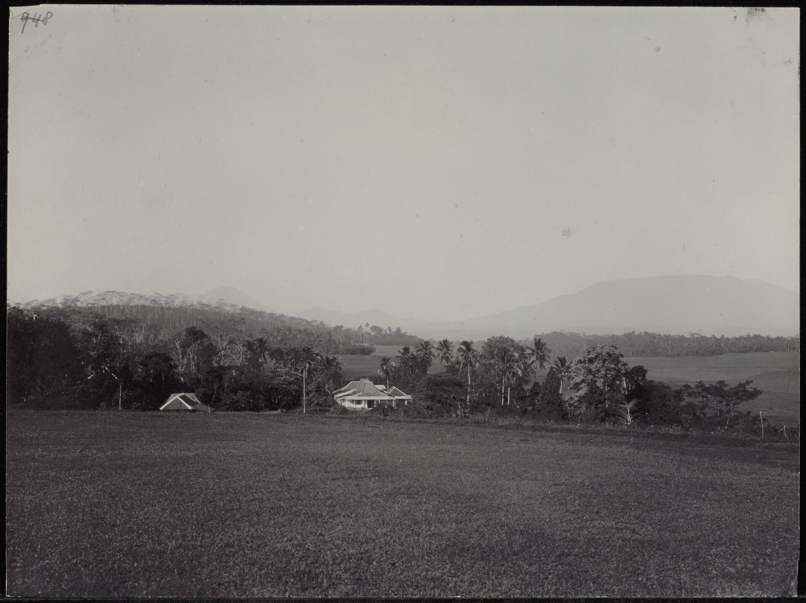 Gezicht op veld met achterliggende gebouwen en bossage