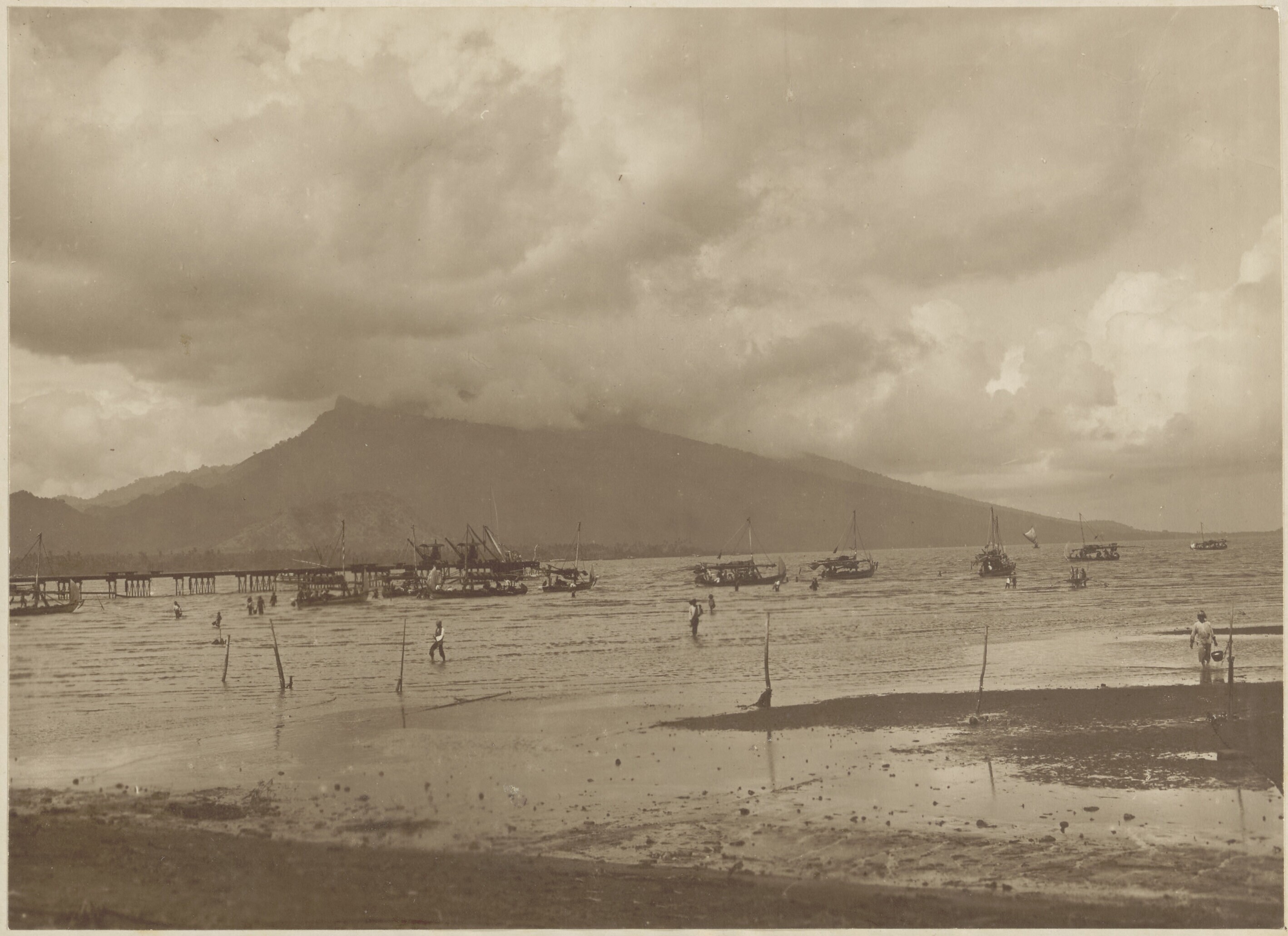 Strandgezicht met prauwen en steiger bij Panaroekan,...