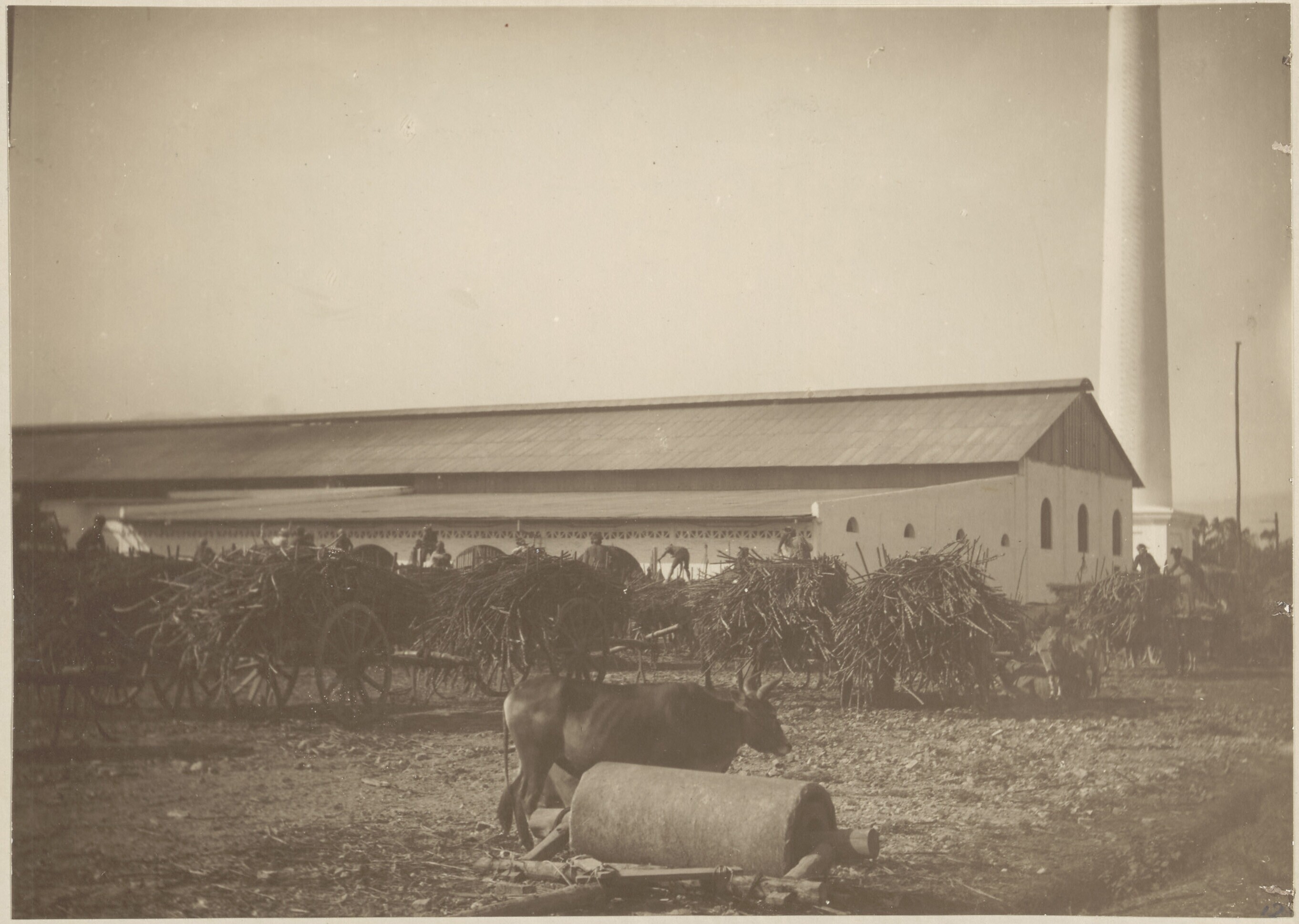 Ossenwagens met suikerriet bij suikerfabriek 'Tangar...