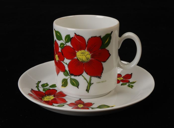 Kop en schotel van Van Nelle, met rood bloemmotief