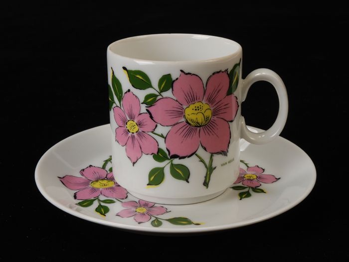 Kop en schotel van Van Nelle, met roze bloemmotief