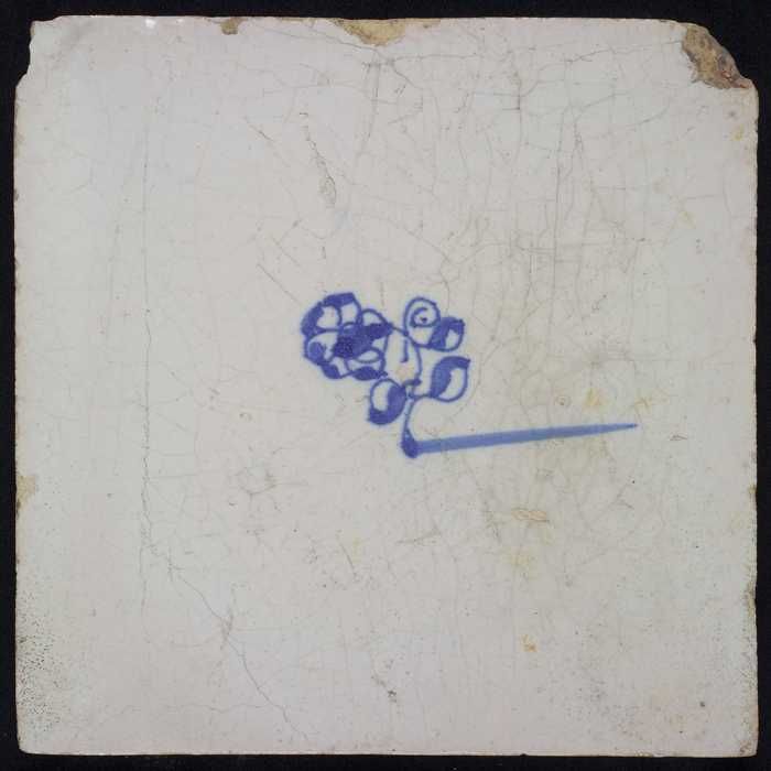 Bloemtegel, bloeiende plant, blauw decor op wit fond...