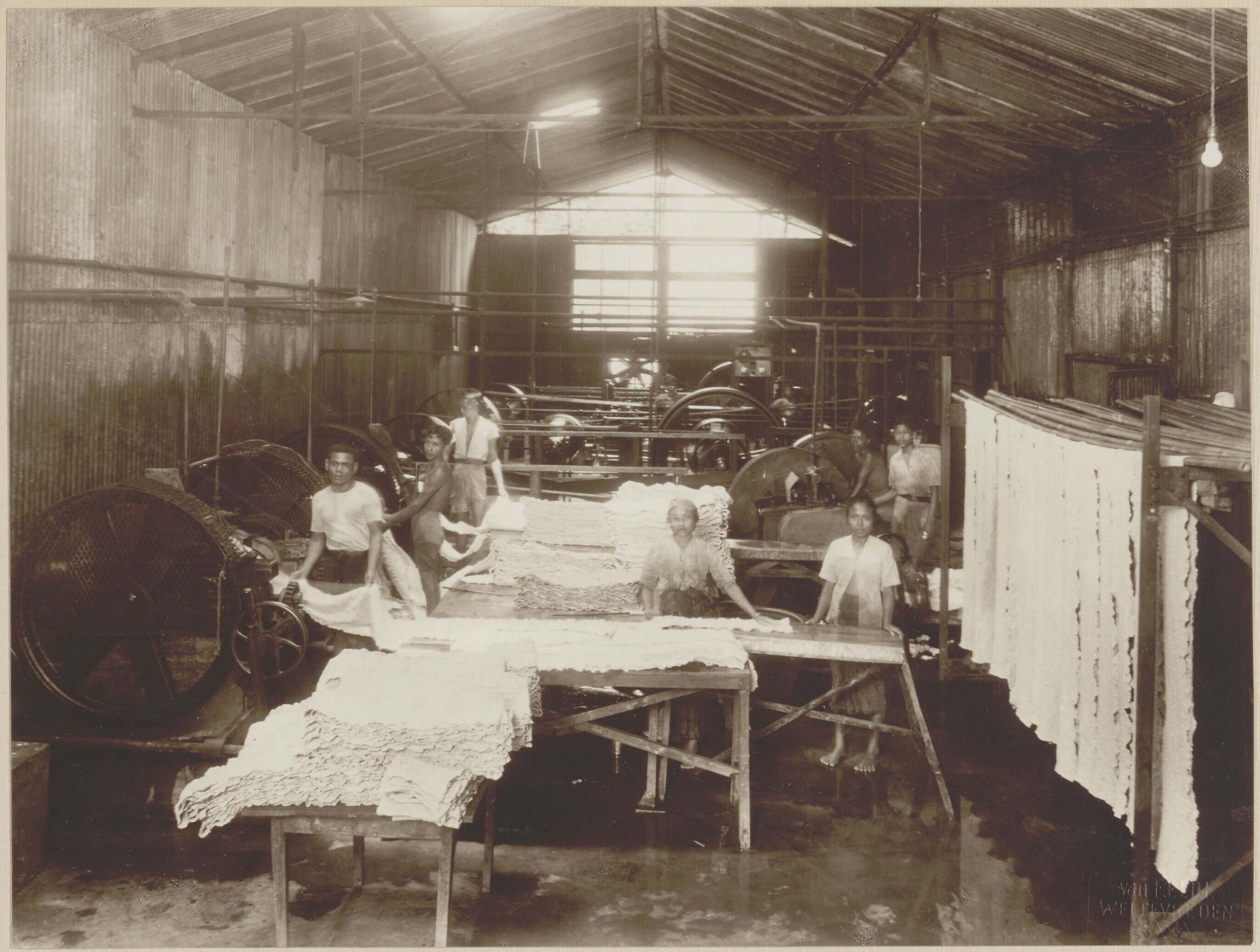 Arbeiders met crêpe in een fabriek op de rubberplant...