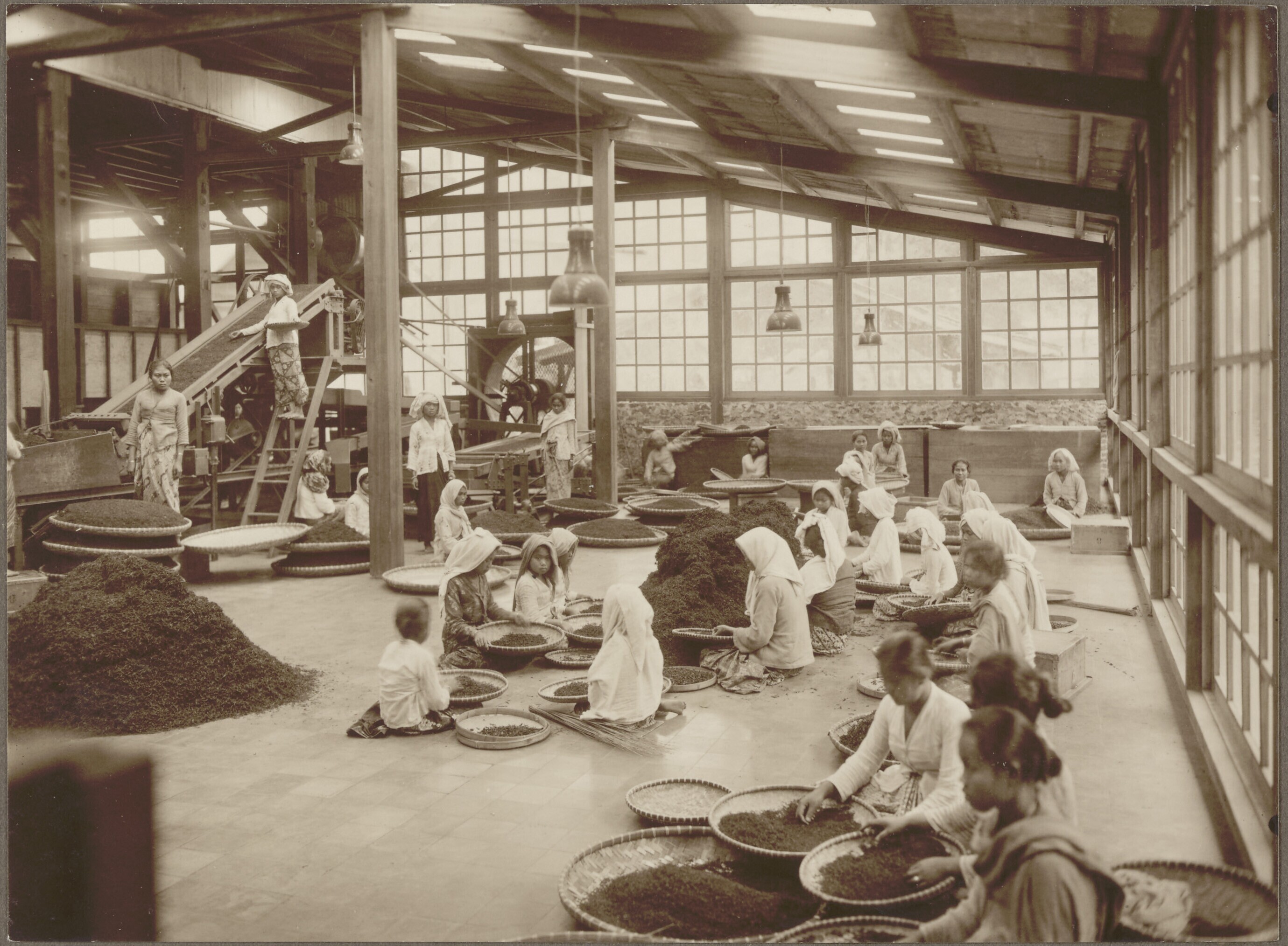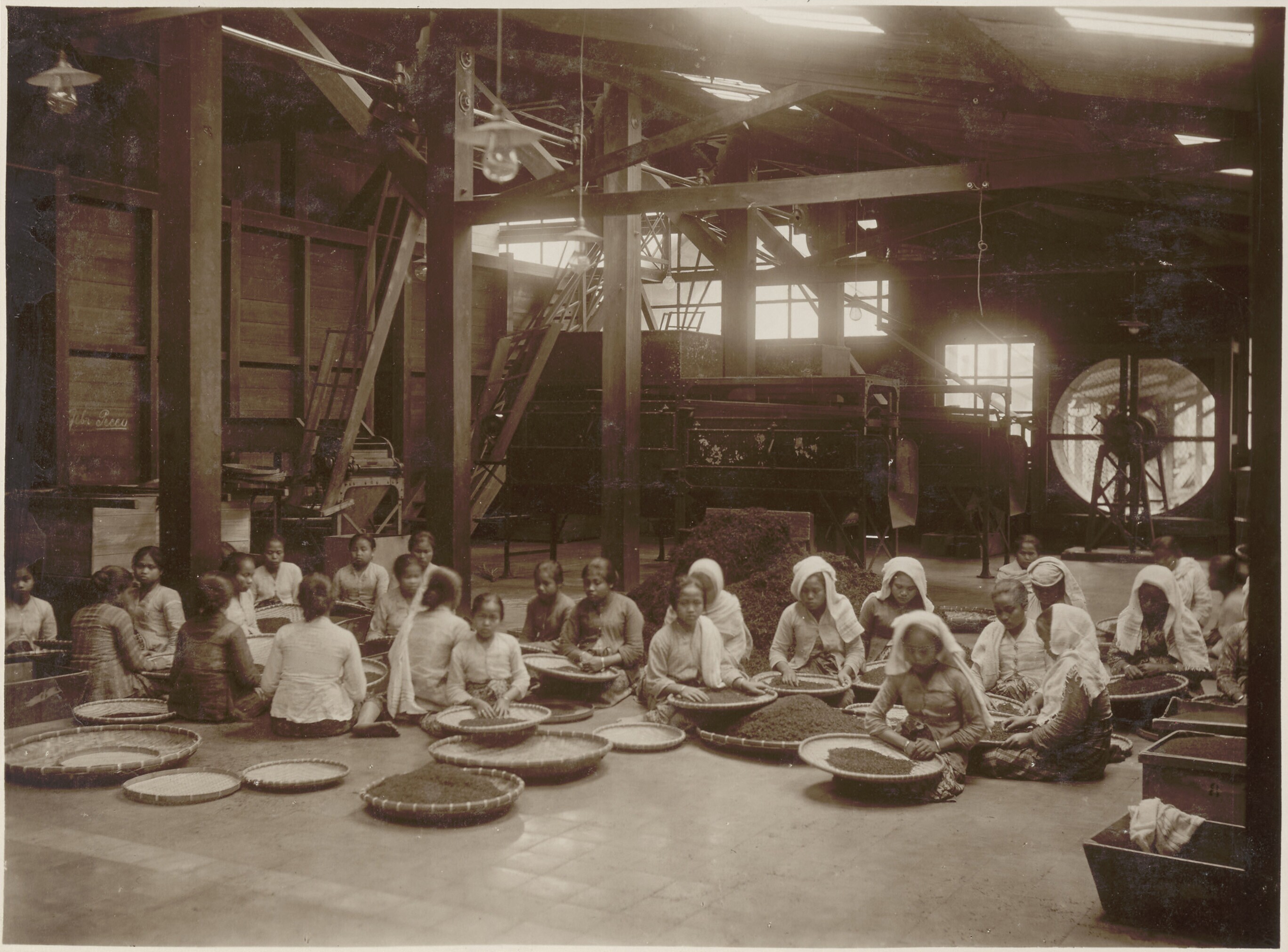 Vrouwen sorteren thee in de fabriek van de plantage ...