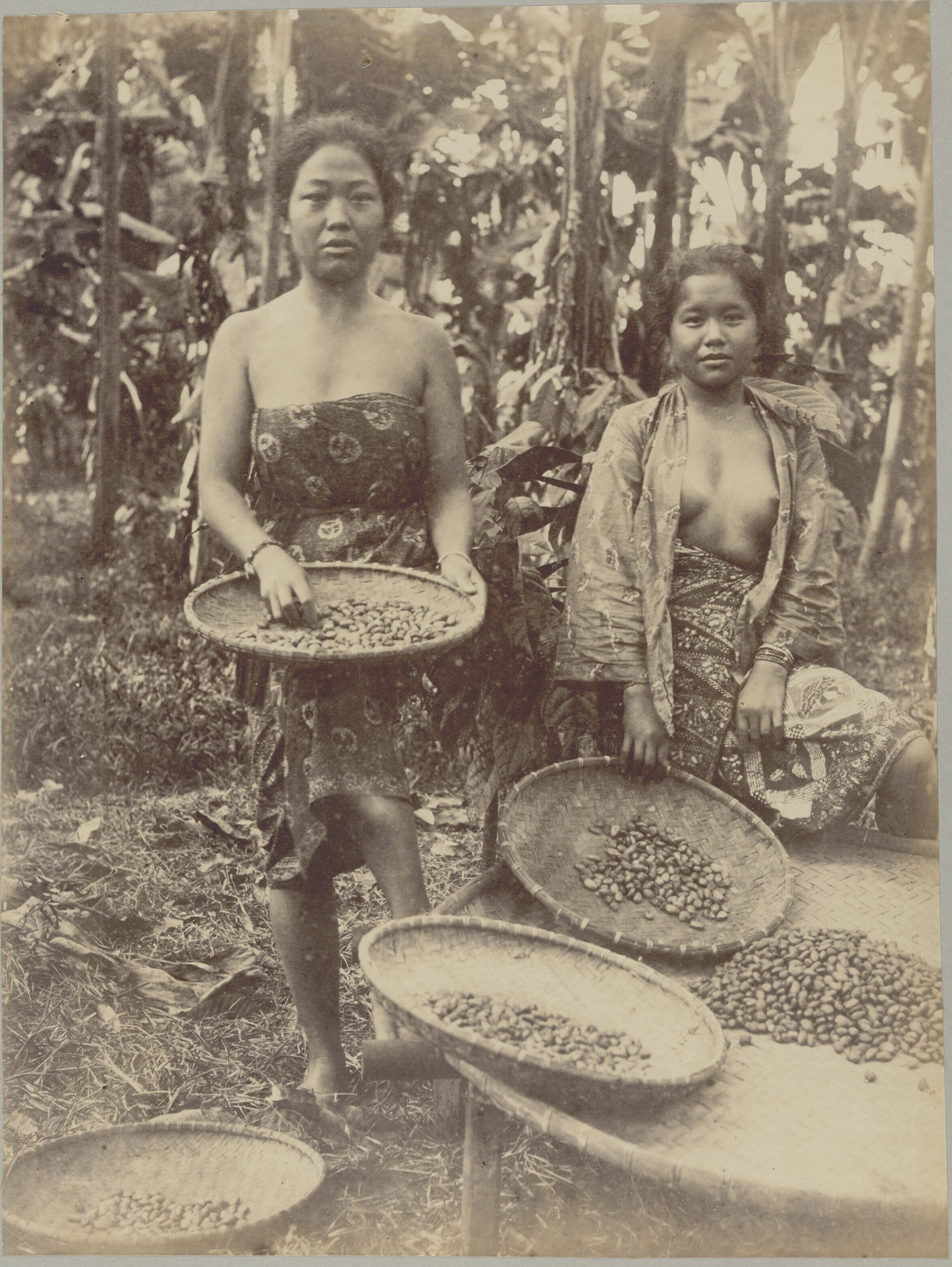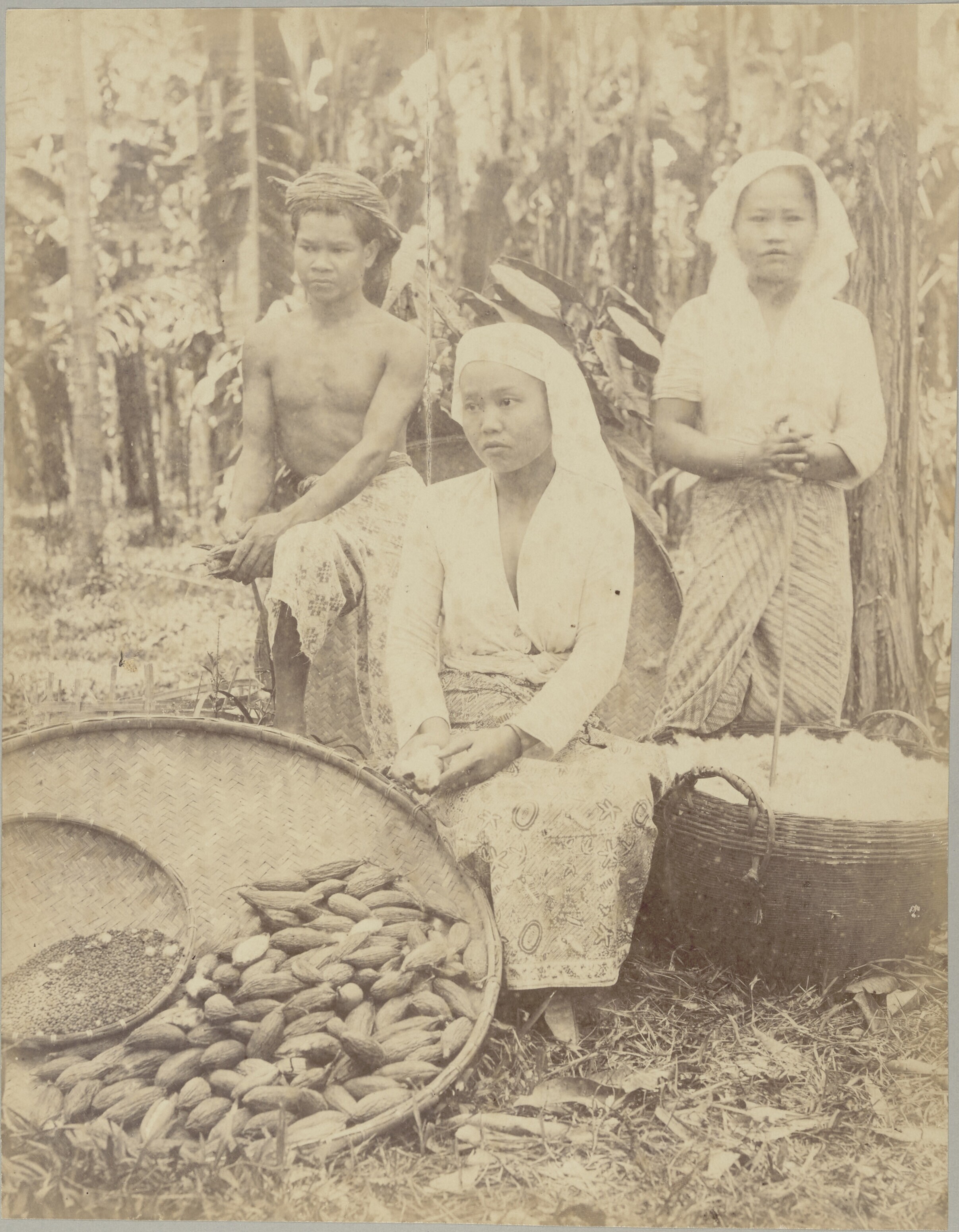 Portret van twee vrouwen tijdens het oogsten van cacao