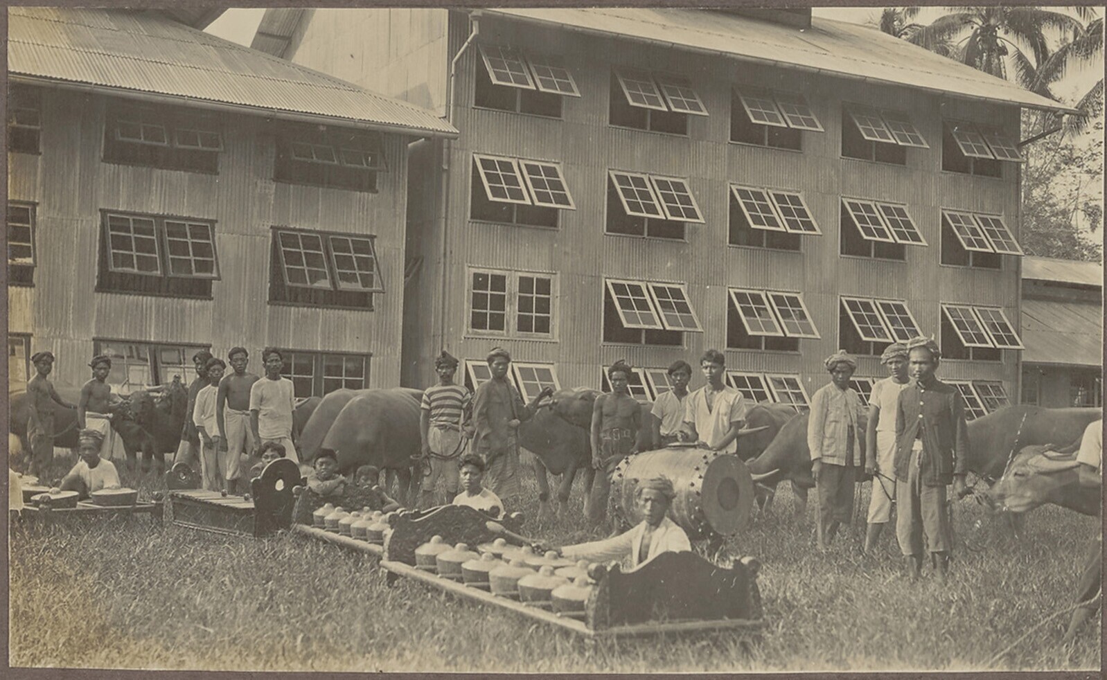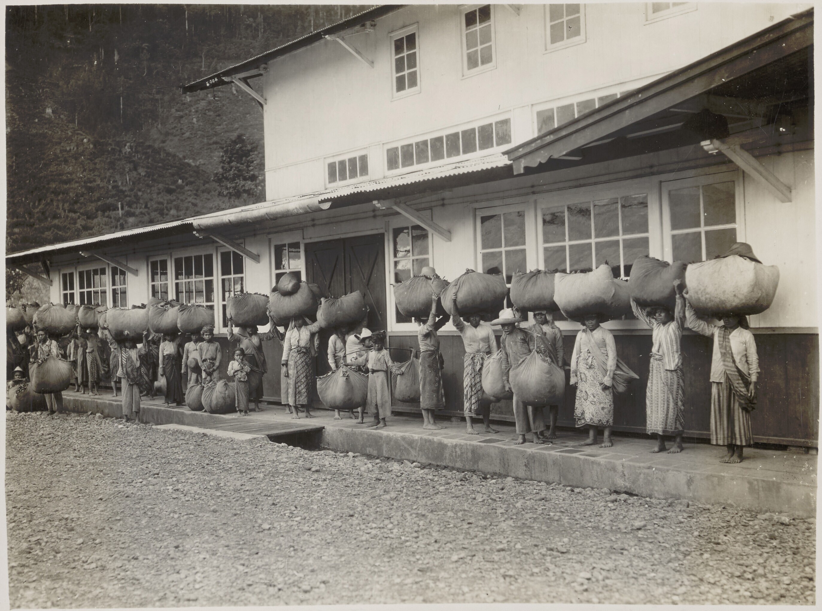 Theepluksters en-plukkers met de oogst bij de fabrie...