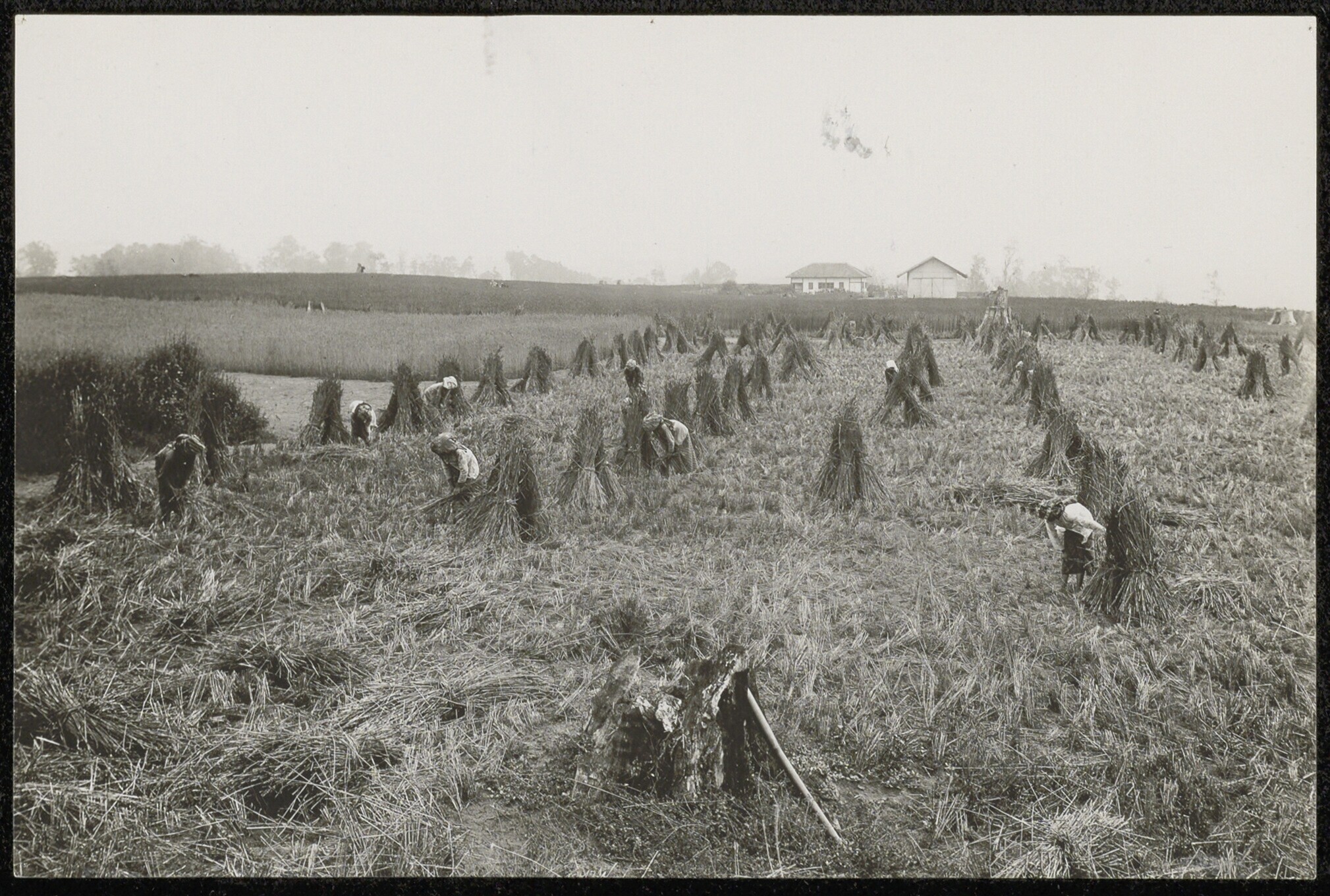 Het binden van tarweschoven op een onderneming in Po...
