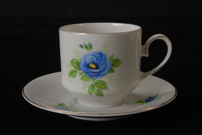 Theekop en schotel met blauw theeroosmotief en groen...