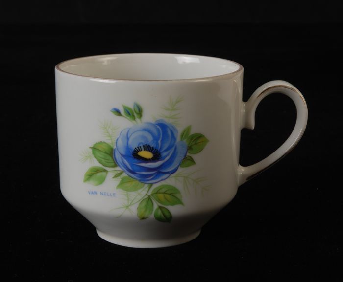 Theekop met blauw theeroosmotief en blauwe letters v...