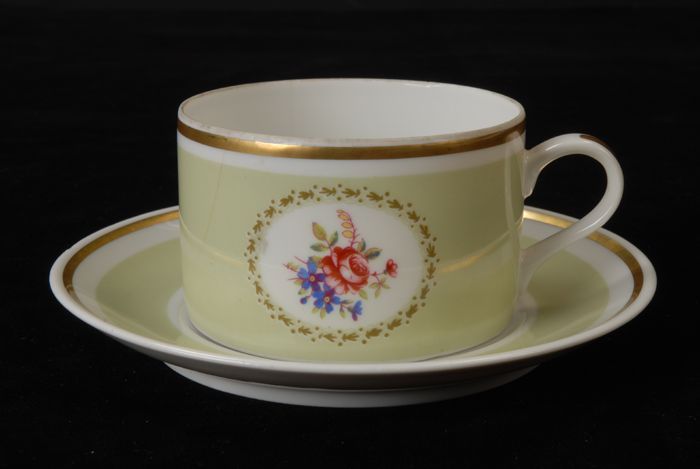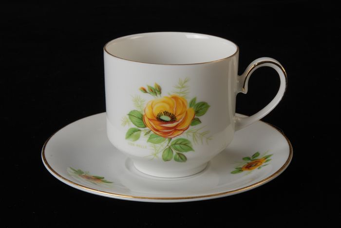 Theekop en schotel met geel theeroosmotief en groene...