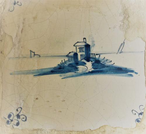 Tegel van aardewerk met tinglazuur voorstellende Lan...