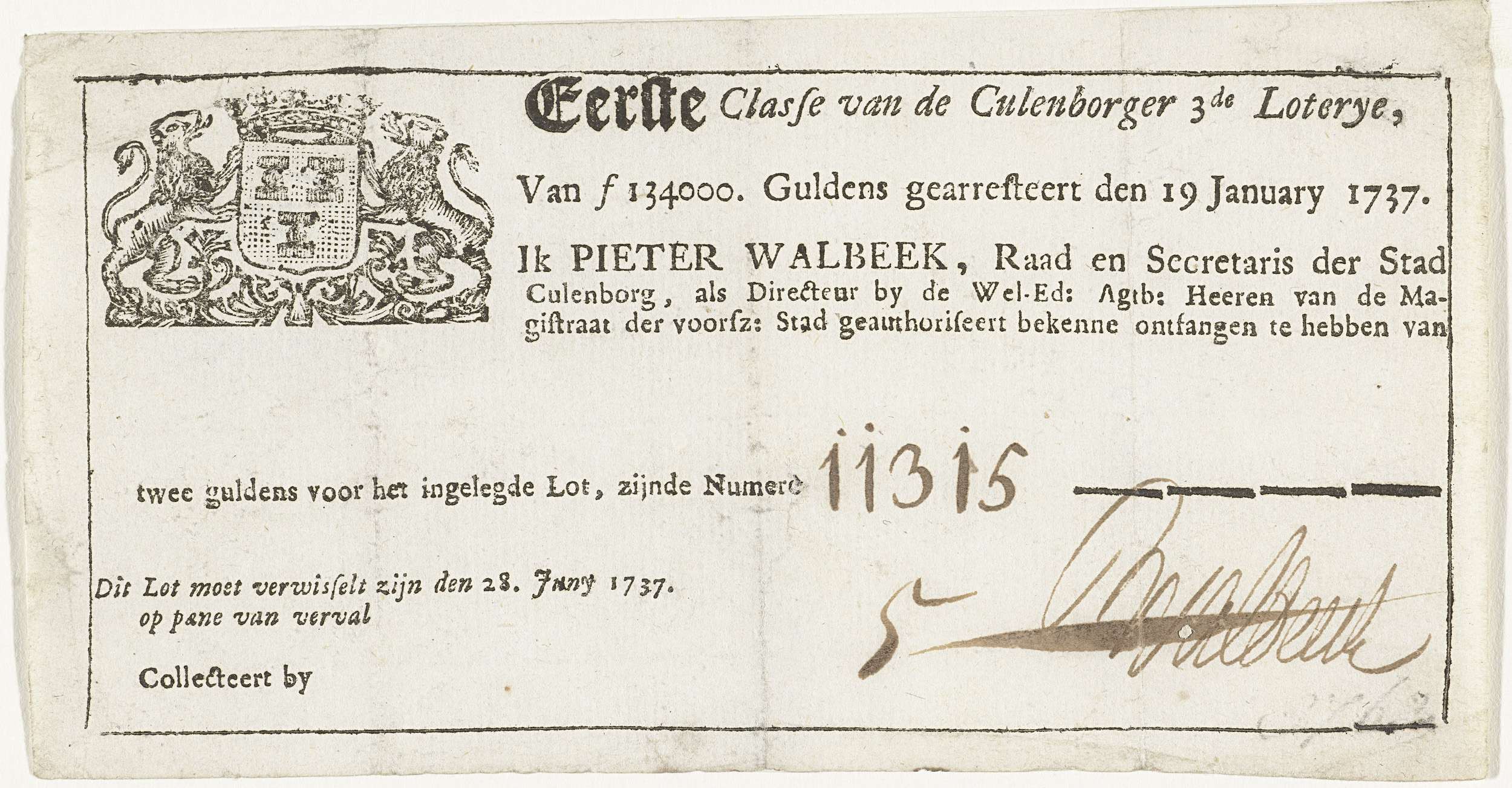 Loterijbriefje, 1737