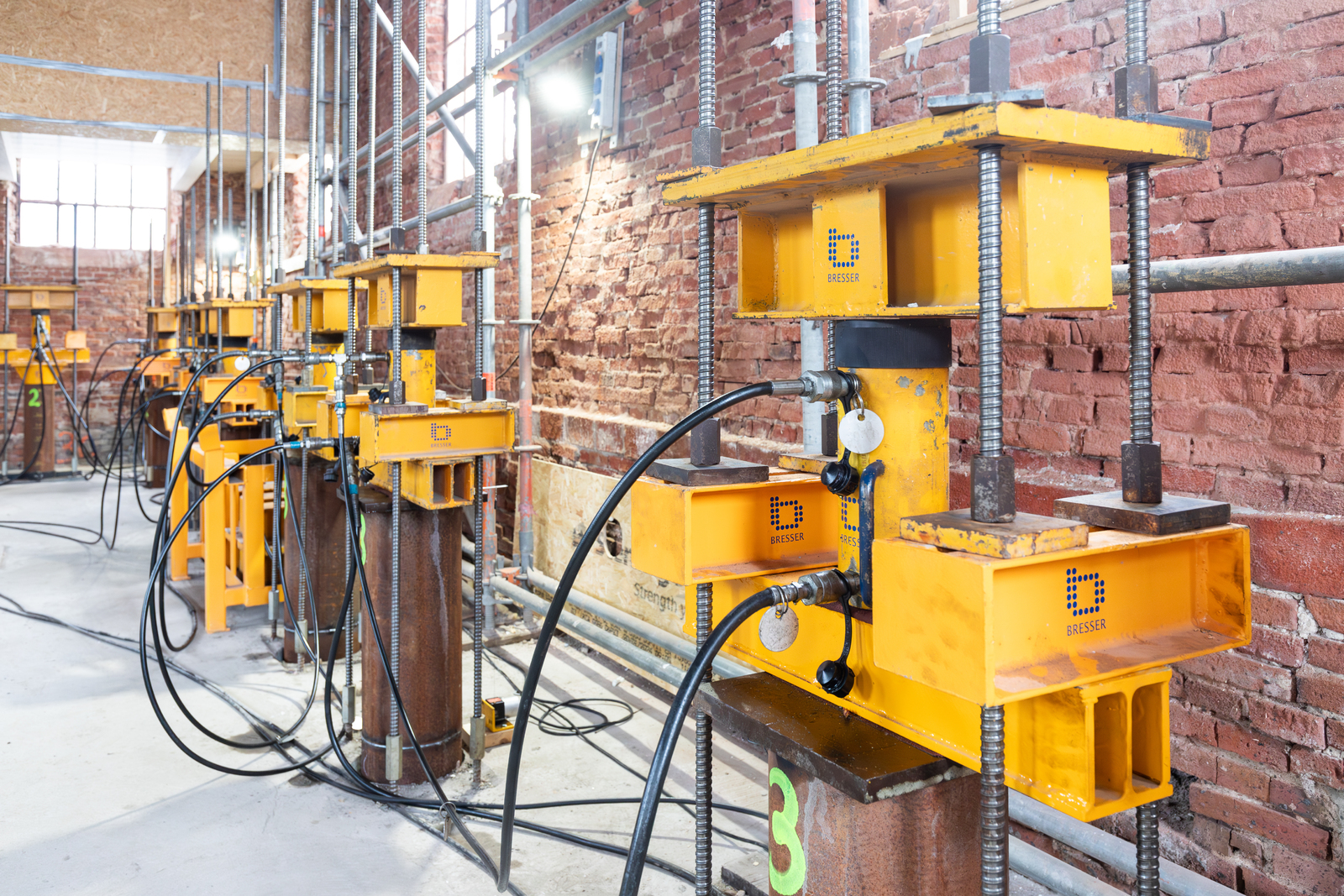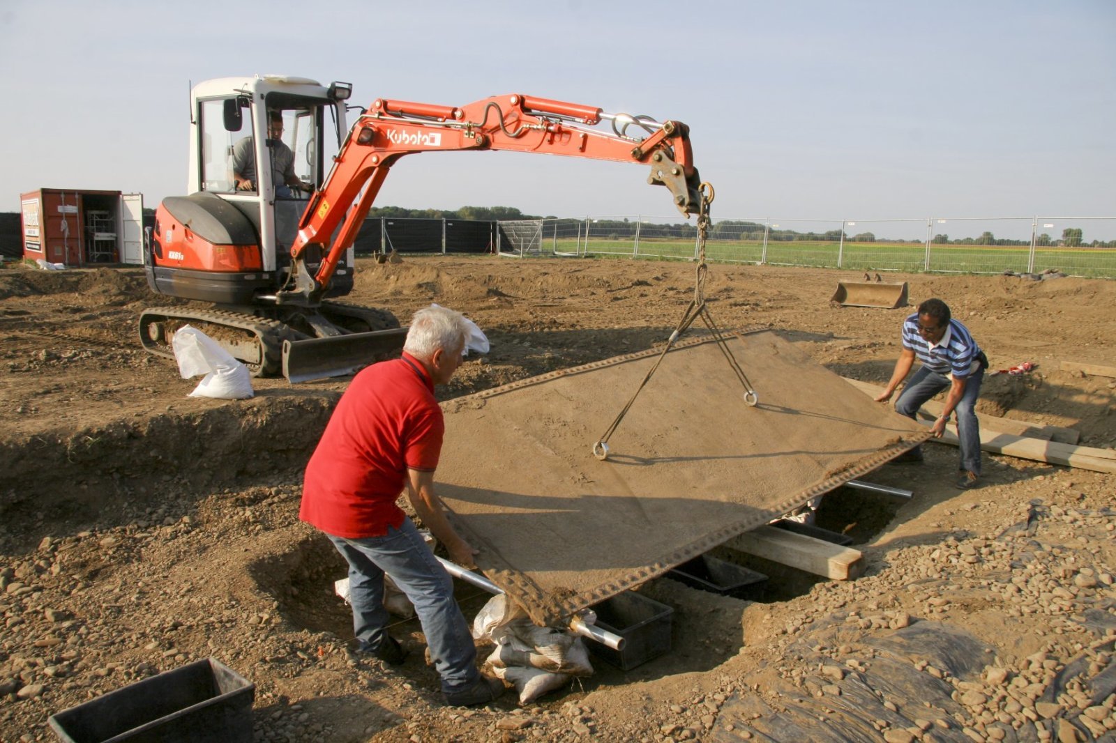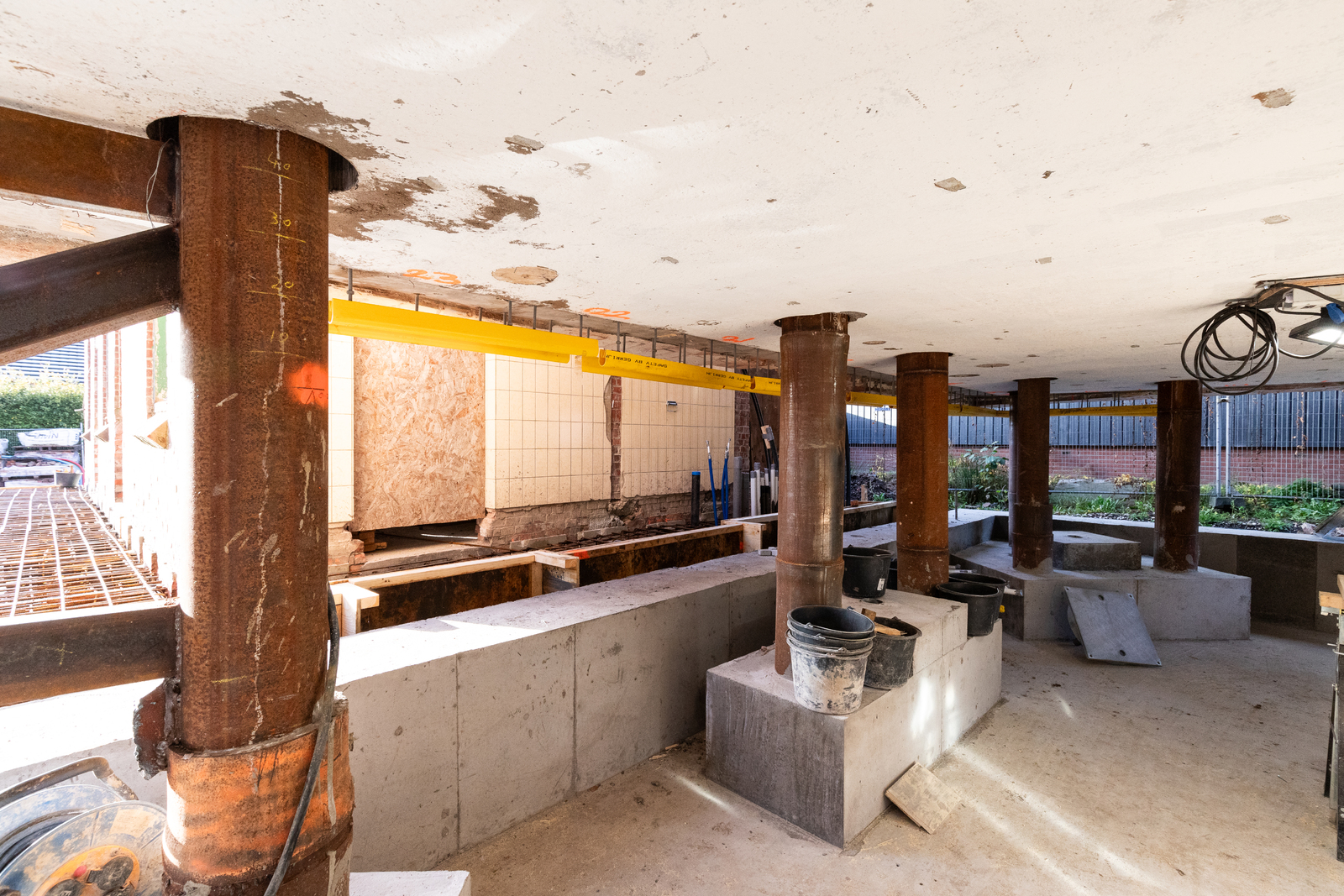 Funderingswerkzaamheden, met omhoog gevijzelde kerk