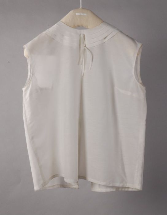 Witte getailleerde mouwloze blouse met rond geplooid...