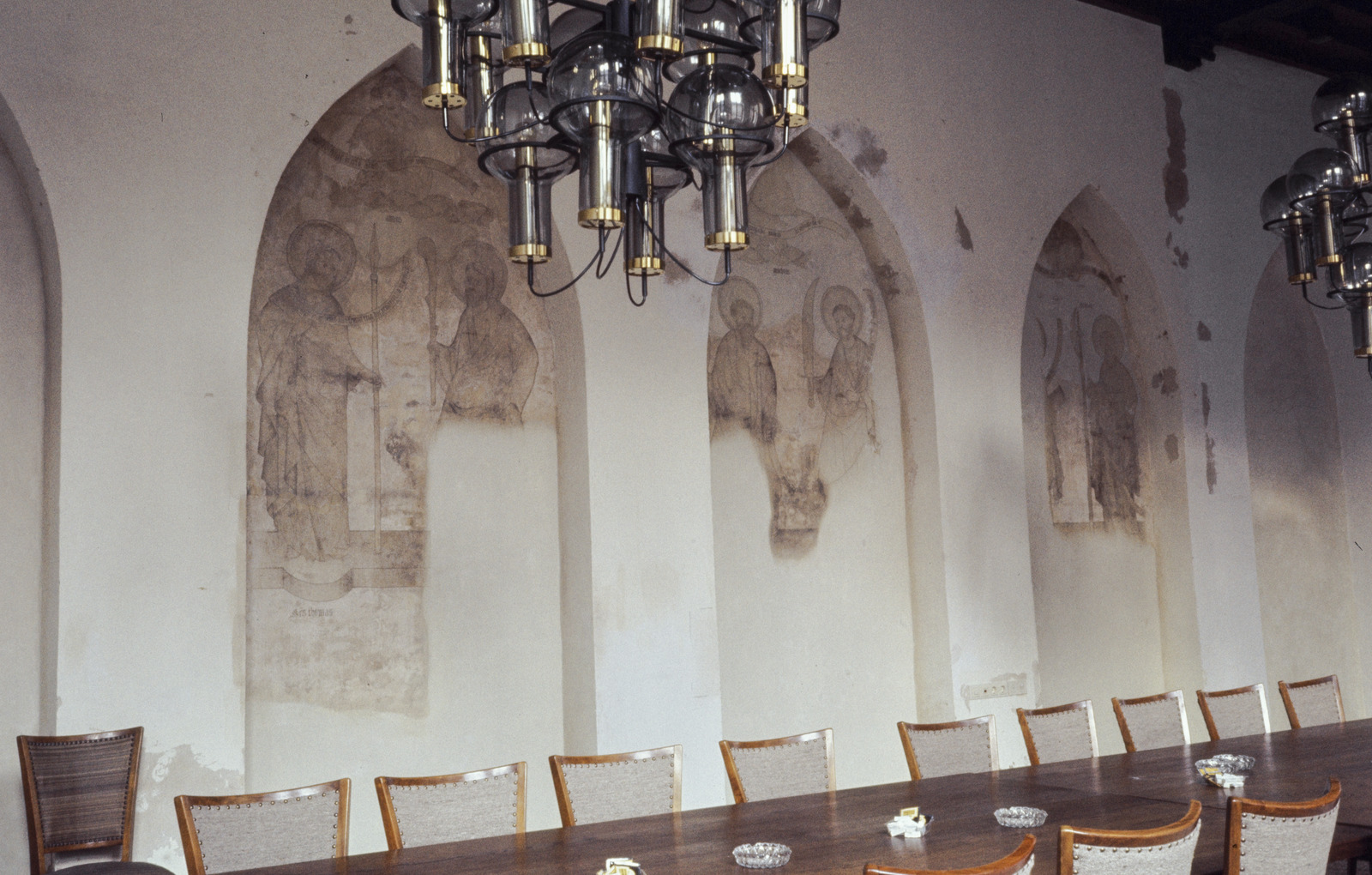 Interieur, muurschildering in 4 nissen in zaal - na ...